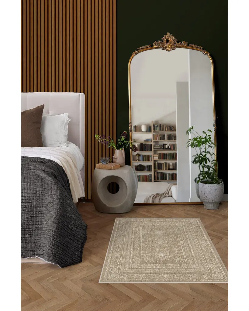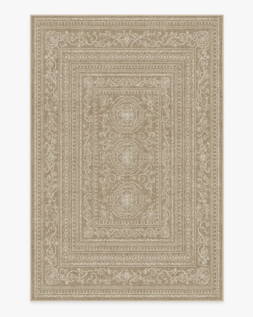 Understated elegance. Our Gisele Natural Rug boasts an intricate floral and geometric border pattern surrounding center medallions in white set atop a beige background. Water-resistant, stain-resistant, and machine-washable.