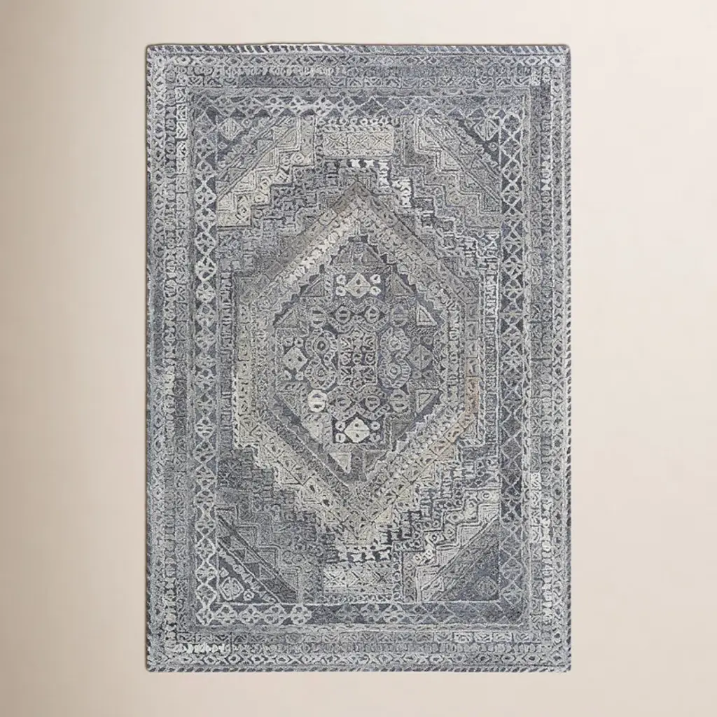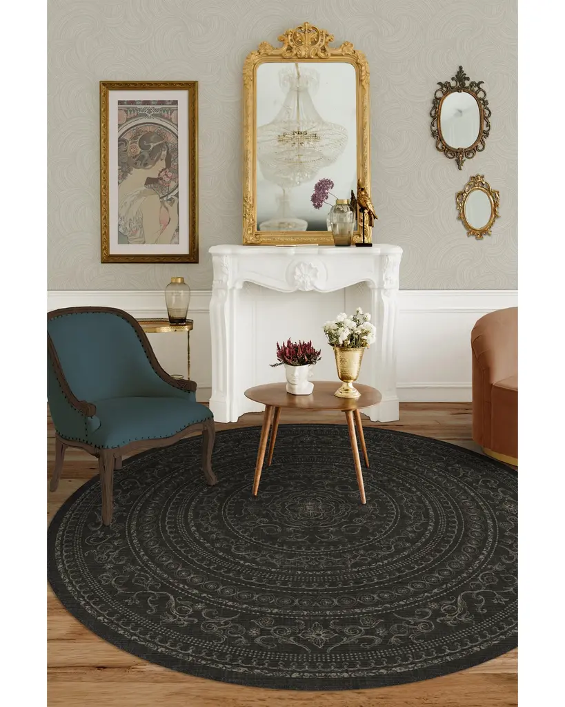 Understated elegance. Our Gisele Soft Black Rug boasts an intricate floral and geometric border pattern surrounding center medallions in beige set atop a black background. Water-resistant, stain-resistant, and machine-washable.