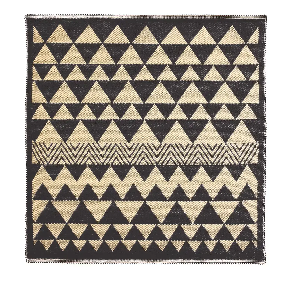 Distinguished by a geometric motif of triangles in two different sizes neatly arranged in rows, this rug is a one-of-a-kind textile design handwoven by the expert hands of master weavers. It belongs to the Mesa Collection designed by Gavino Sanna, a renowned Italian advertiser who conceived of it as an homage to Sardinian culture.