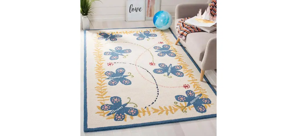 The Gladwyne Kid's Rug features a colorful design with beautiful butterflies for a fun addition to your kid's room. These rugs are made with pure soft wool and hand-tufted to a cotton backing for added cushion.