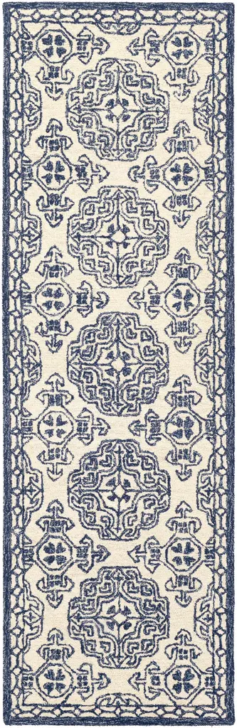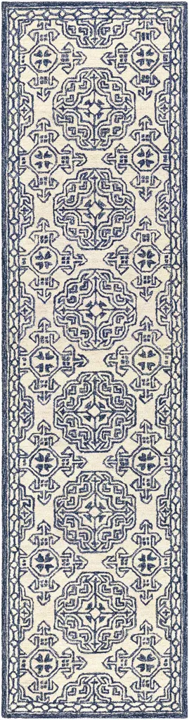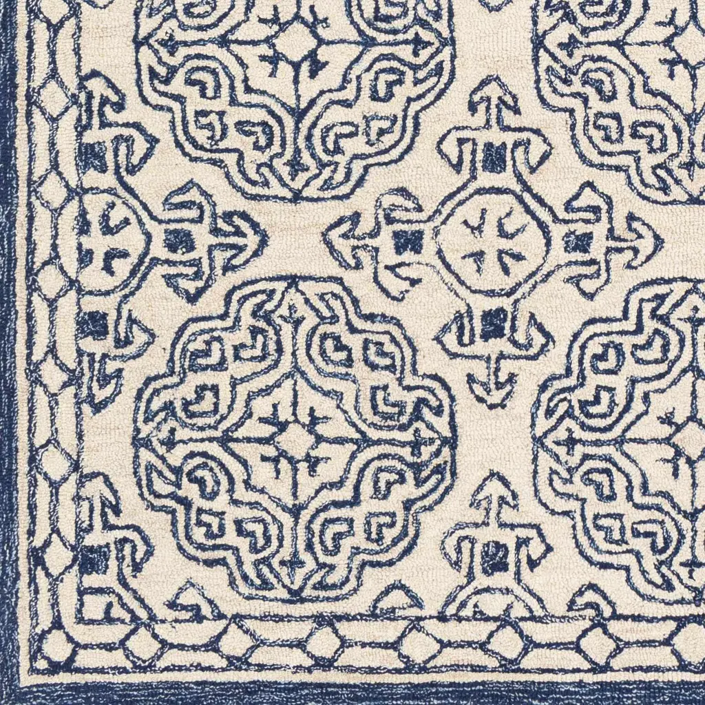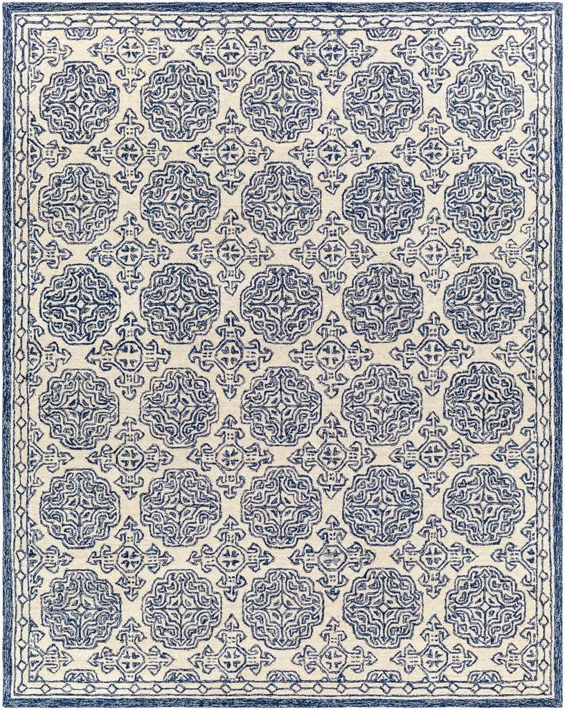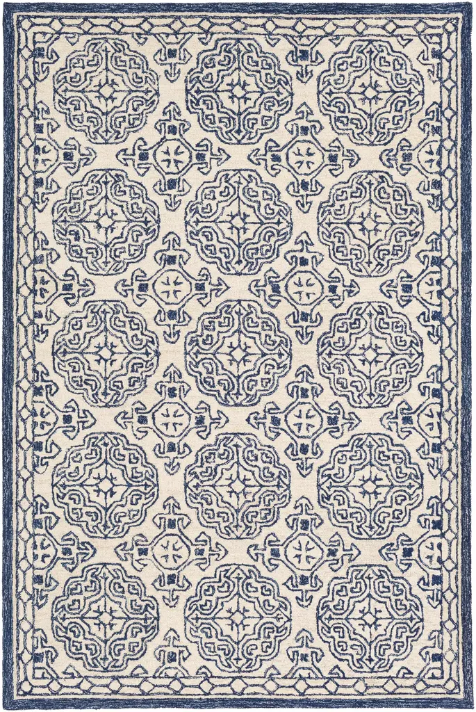 Collection: Glassboro Colors: Beige, Light Blue, Navy Construction: Hand Tufted Material: 100% Wool Pile: Medium Pile Pile Height: 0.23" Styles: Traditional Backing: Canvas Made In: India Thickness: 0.39" Price Range: $$$$$ (Most Affordable)