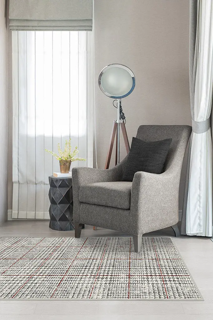 The classic Scottish pattern Glen Plaid layers a sophisticated red stripe against a black and white check background.