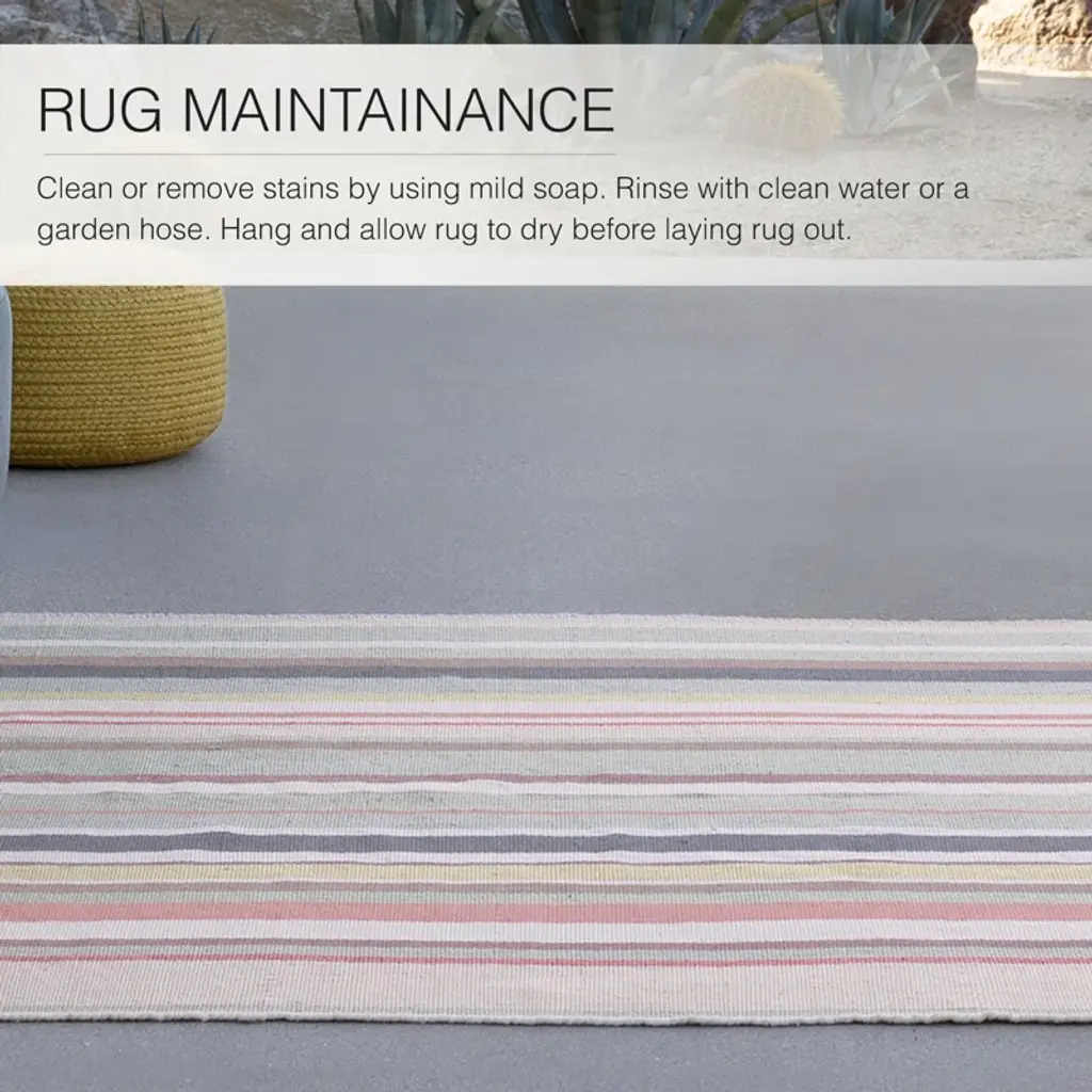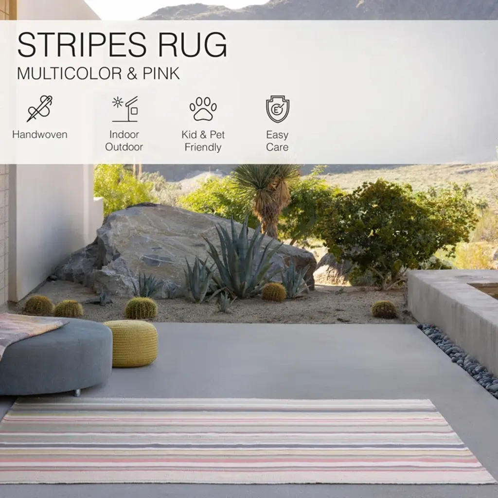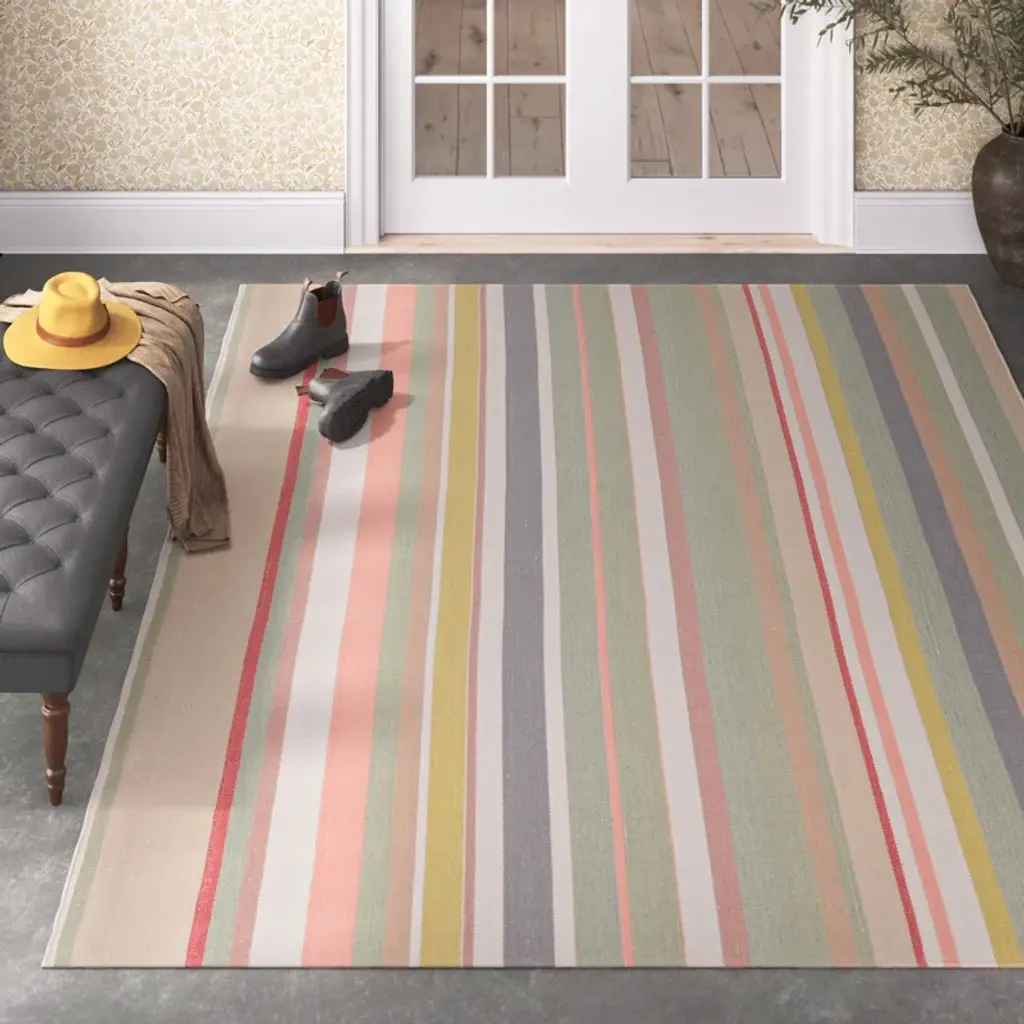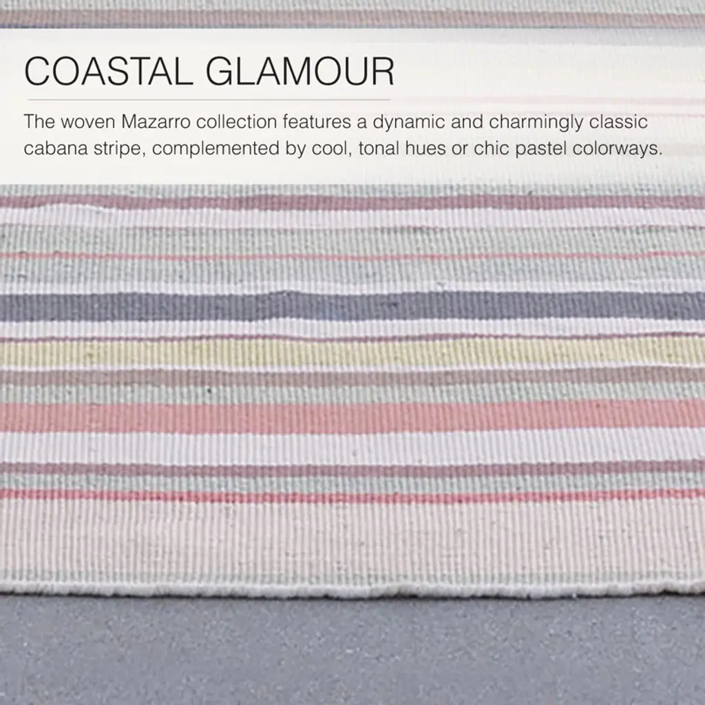 The woven Godina collection features a dynamic and charmingly classic cabana stripe, complemented by cool, tonal hues or chic pastel colorways. The colorful design showcases stripes of varying thickness in a playful colorway of pink, red, blue, cream, and mauve. Crafted to withstand high-traffic areas or livable patio spaces, these stain and water-resistant, flatweave rugs are built for performance with finely woven and durable polyester.
