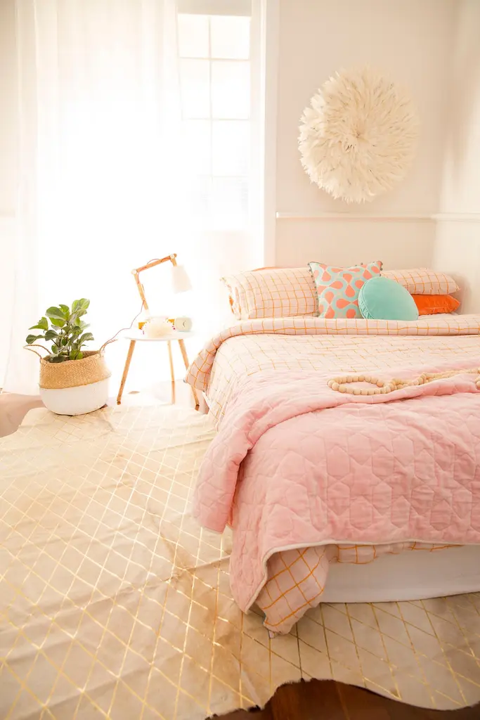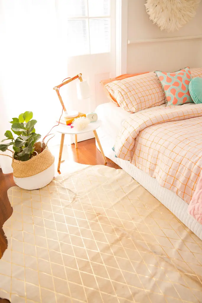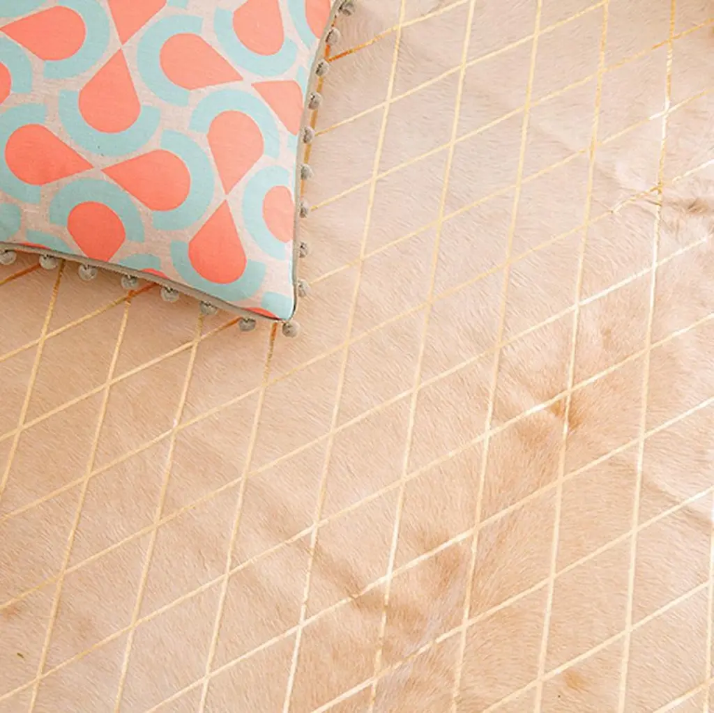 The Arlequin hide is a design collaboration with our sister brand, Amigos de Hoy.Premium quality natural cowhide has been elegantly finished with a metallic devore technique in a fine diamond pattern.This caramel base hide is available with gold metallic pattern. Available in 2 sizes: 3m2 and 4m2.Approximate size guide3m2 = 2m x 1.64m2 = 2.4 x 1.8Art Hide rugs are usually made to order. Please allow 4 - 5 weeks prior to delivery.
