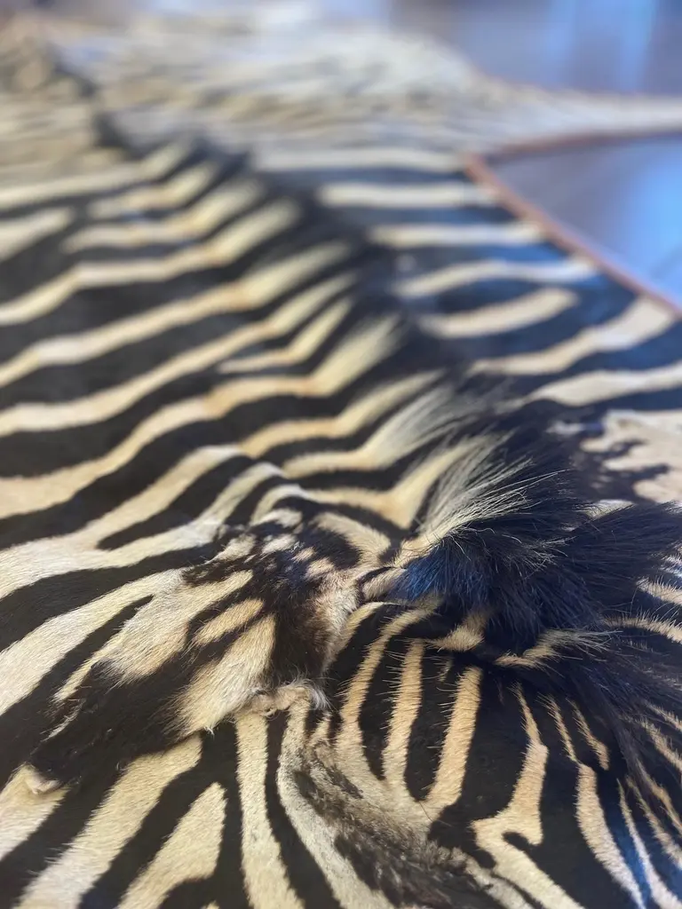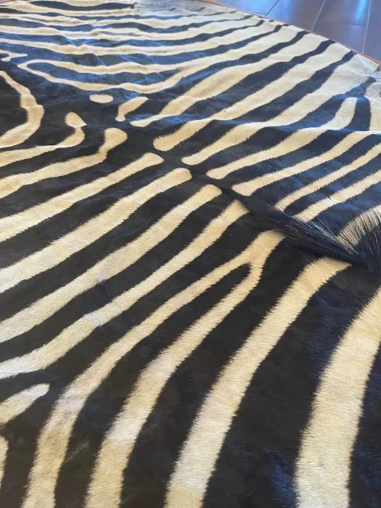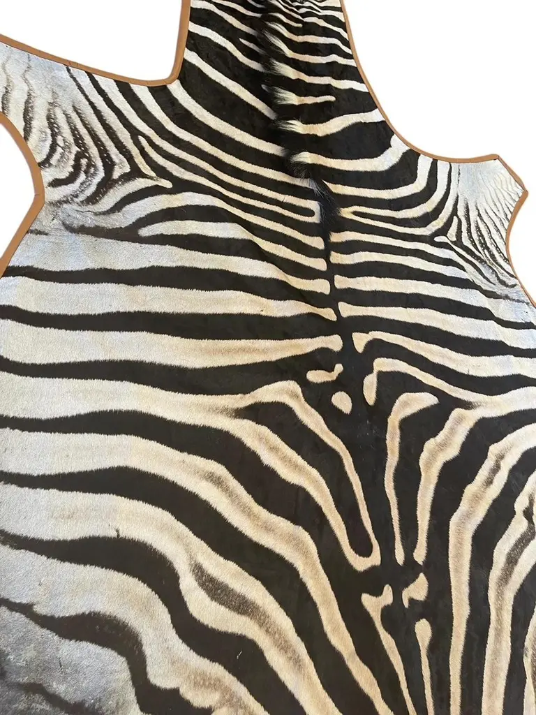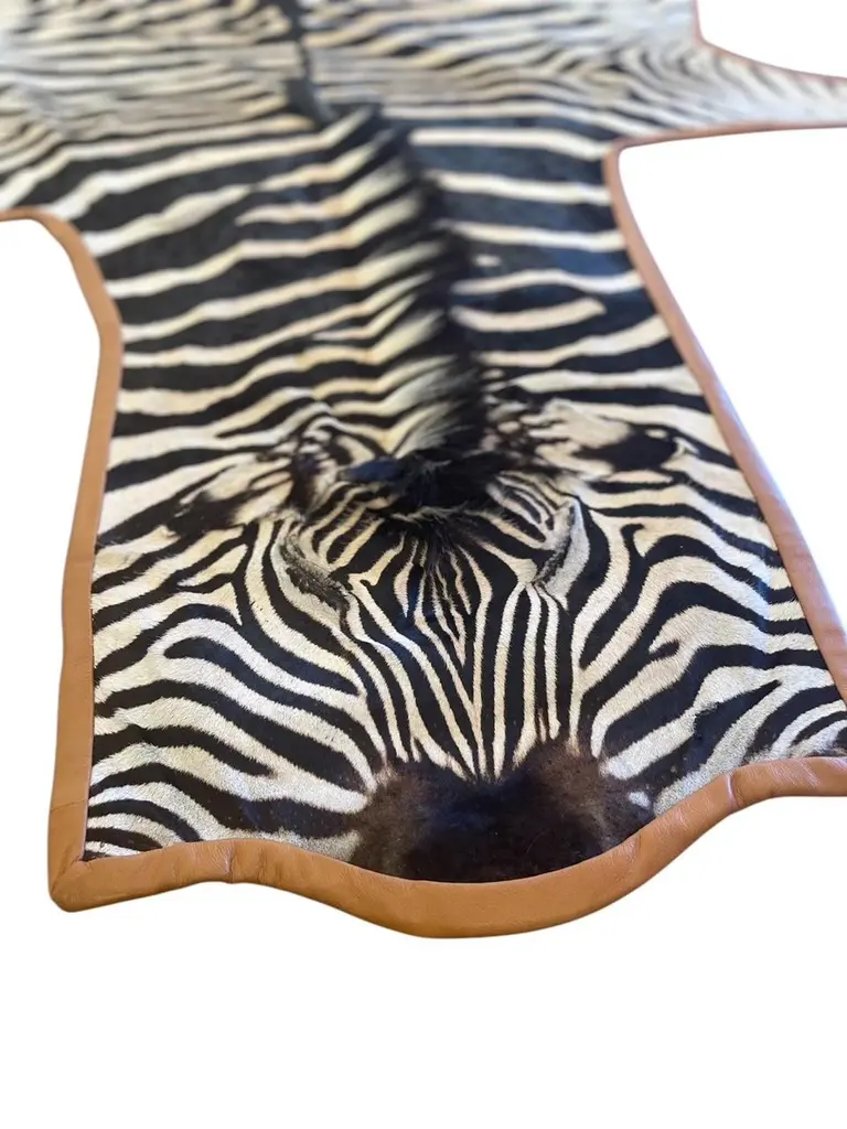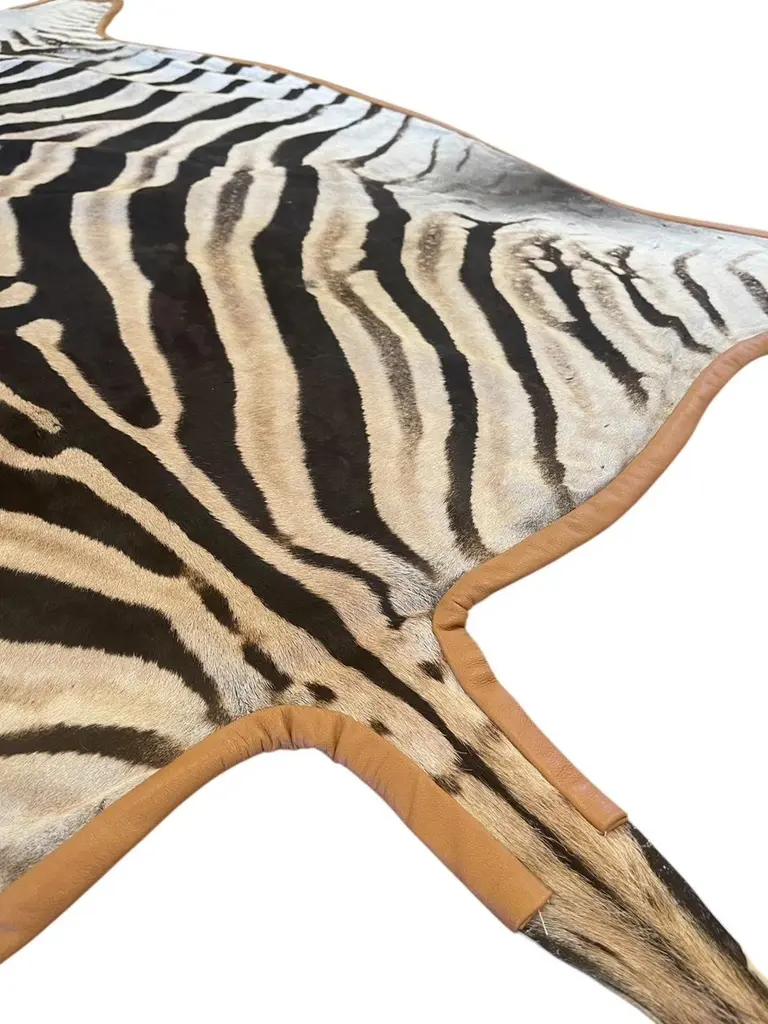 Come and browse our selection of South African Zebra Rugs. With our superb craftsmanship and quality stock, we can assure you that this stable luxury item will last for years to come. Each rug is fitted with a weighted handstitched lining. This zebra hide was hand picked to ensure our customers with the best quality. The orange, Italian leather trim creates the perfect touch of elegance. This zebra rug will be the highlight in any room.