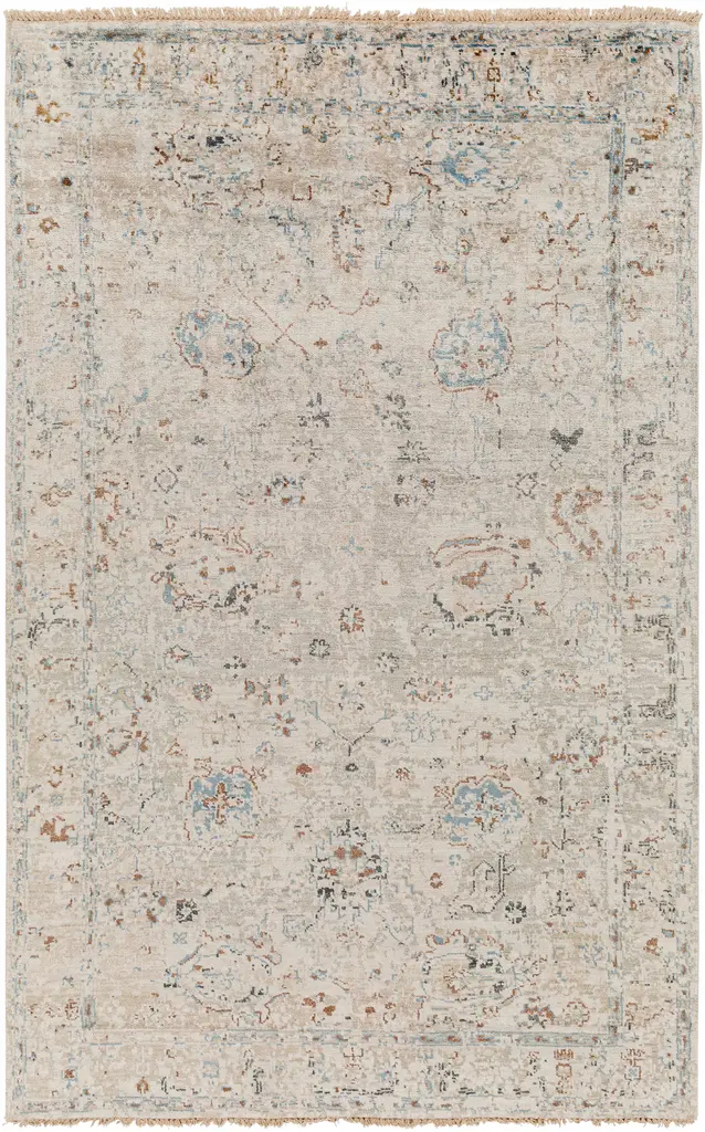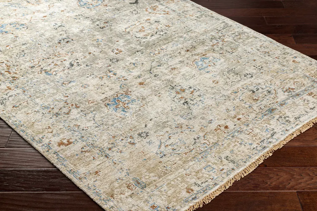 Collection: Gonzaga Colors: Charcoal, Denim, Dark Red, SkyBlue, MediumGray, LightGray Construction: Hand Knotted Material: 100% Viscose Pile: Low Pile Pile Height: 0.19" Styles: Traditional Made In: India Thickness: 0.28" Fringe Length: 1" Price Range: $$$$$ (Premium)