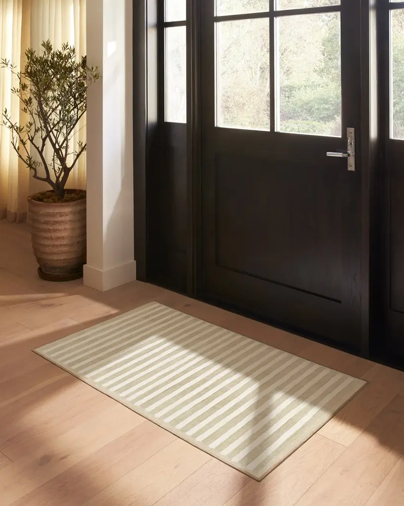 Let luxury in with our goop Elin Stripe Latte Cream Rug. Inspired by traditional Indian dhurrie designs, this striped style features imperfect lines and minimalist stair-stepped motif edges. Its soft taupe and bright cream colors create a classic contrast against a natural warm background. Water-resistant, stain-resistant, and machine-washable. Rug colors may vary slightly according to your device and the lighting in your space.