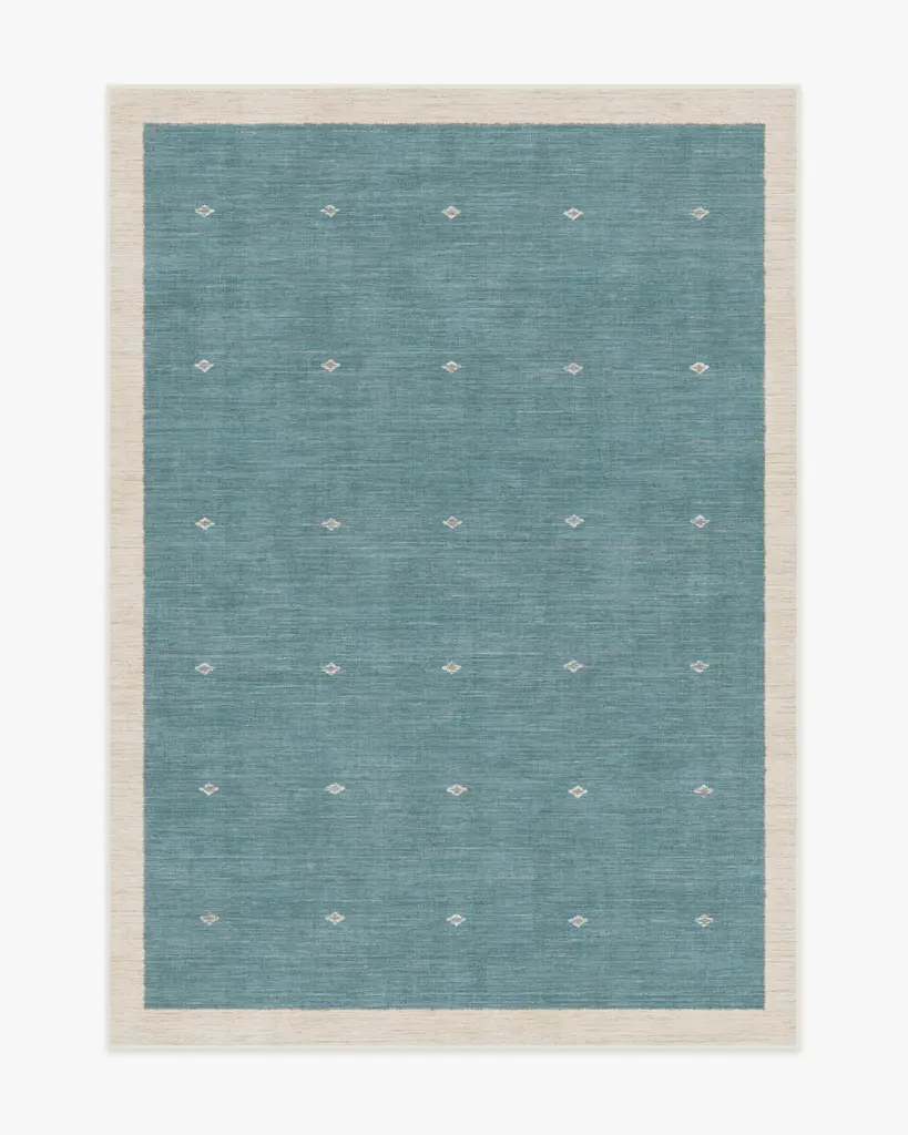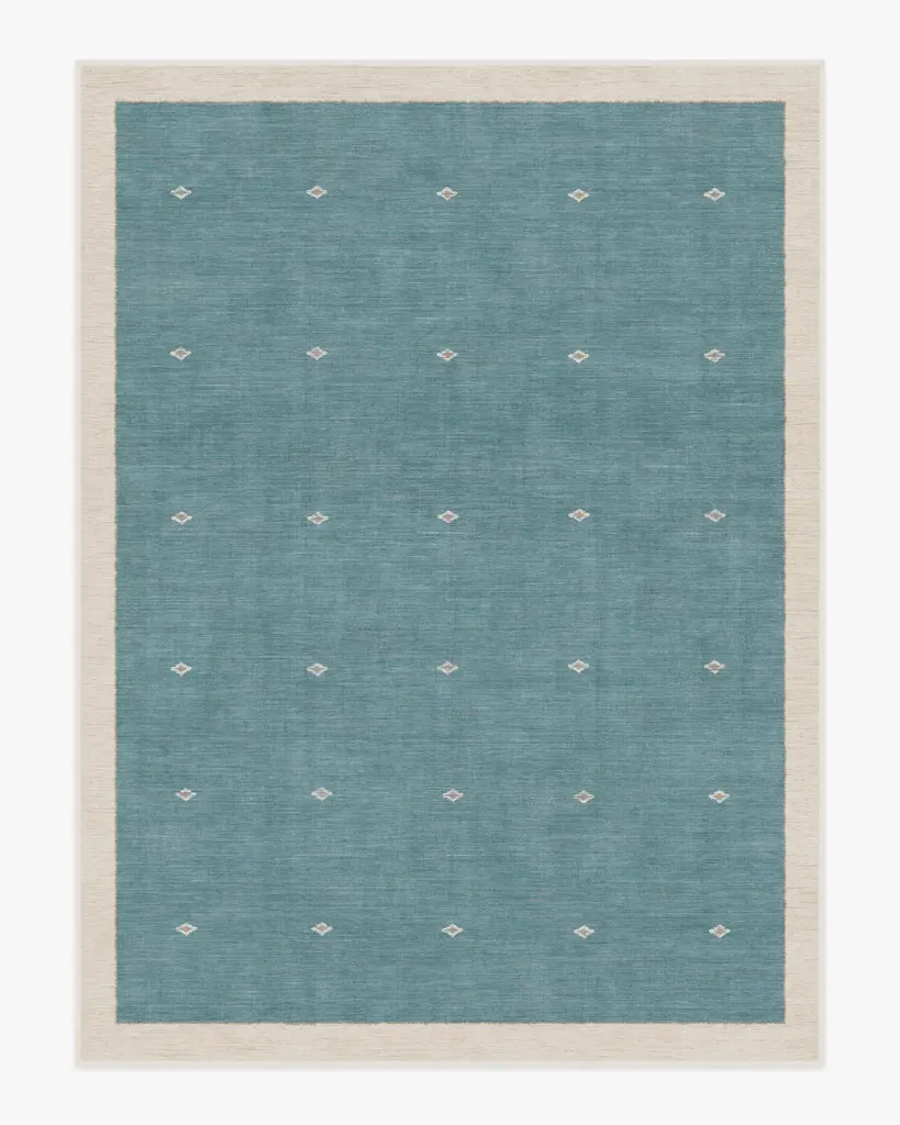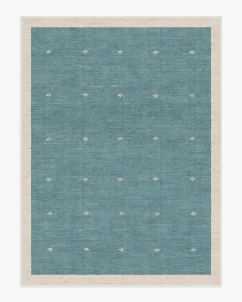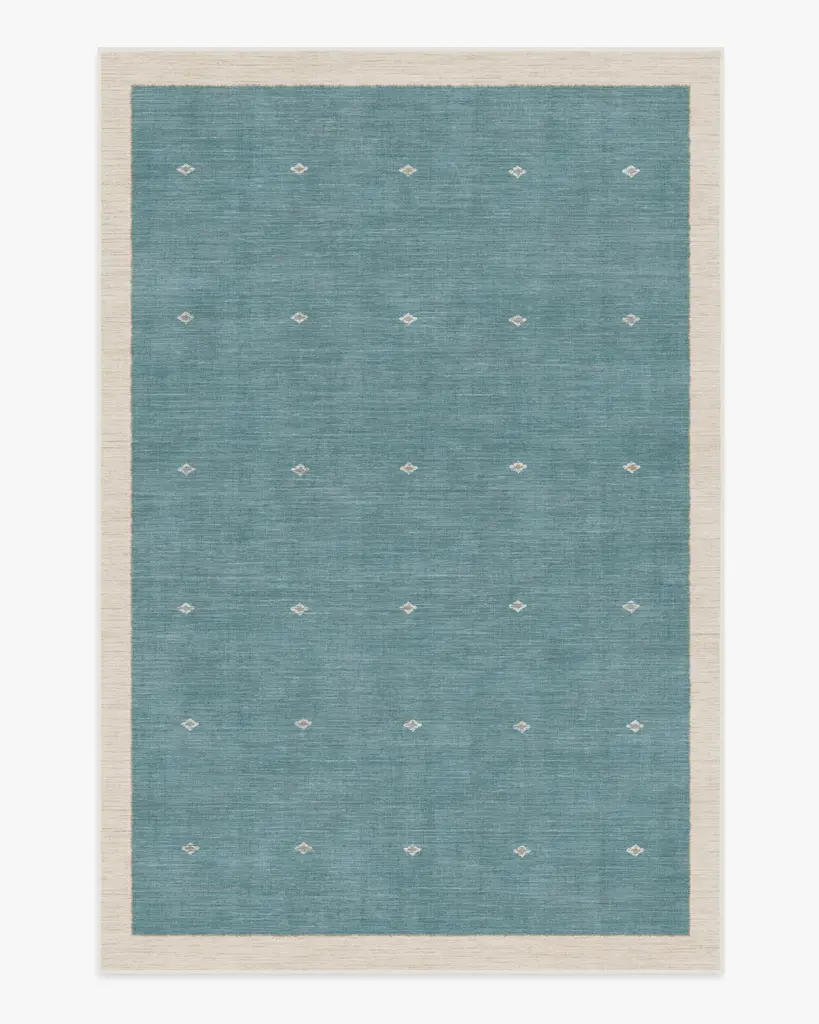 Bask in the glimmer of diamonds with our goop Luna Soft Teal Rug. Inspired by Indian dhurrie designs, this obsession-worthy style features clean and simple borders adorned with symmetrical, micro-patterned diamonds. Each light cream motif elegantly pops against a soft turquoise background, bringing livable luxury to any room. Water-resistant, stain-resistant, and machine-washable. Rug colors may vary slightly according to your device and the lighting in your space.