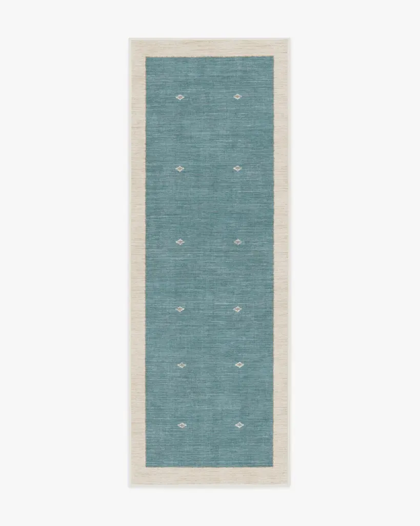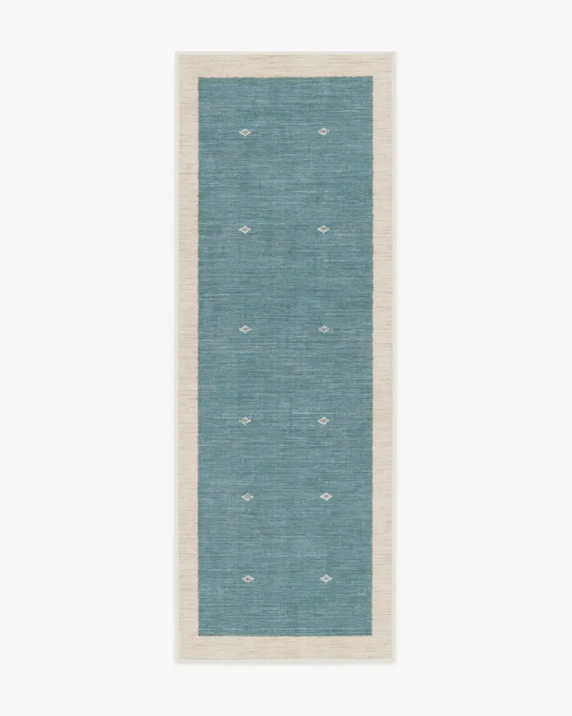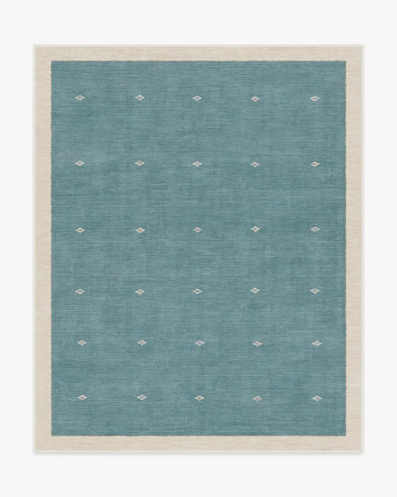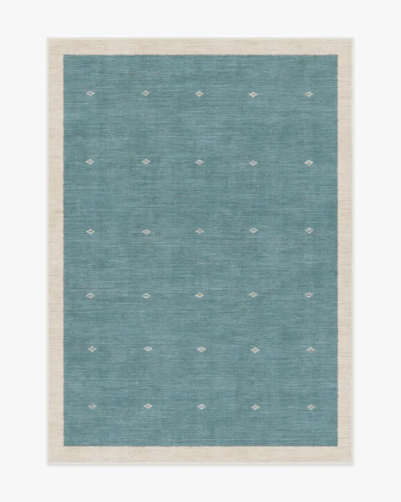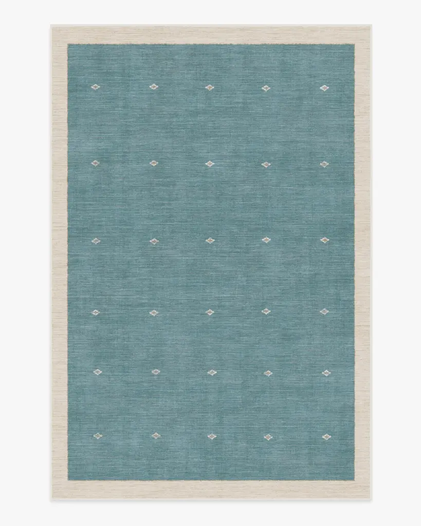 Bask in the glimmer of diamonds with our goop Luna Soft Teal Rug. Inspired by Indian dhurrie designs, this obsession-worthy style features clean and simple borders adorned with symmetrical, micro-patterned diamonds. Each light cream motif elegantly pops against a soft turquoise background, bringing livable luxury to any room. Water-resistant, stain-resistant, and machine-washable. Rug colors may vary slightly according to your device and the lighting in your space.