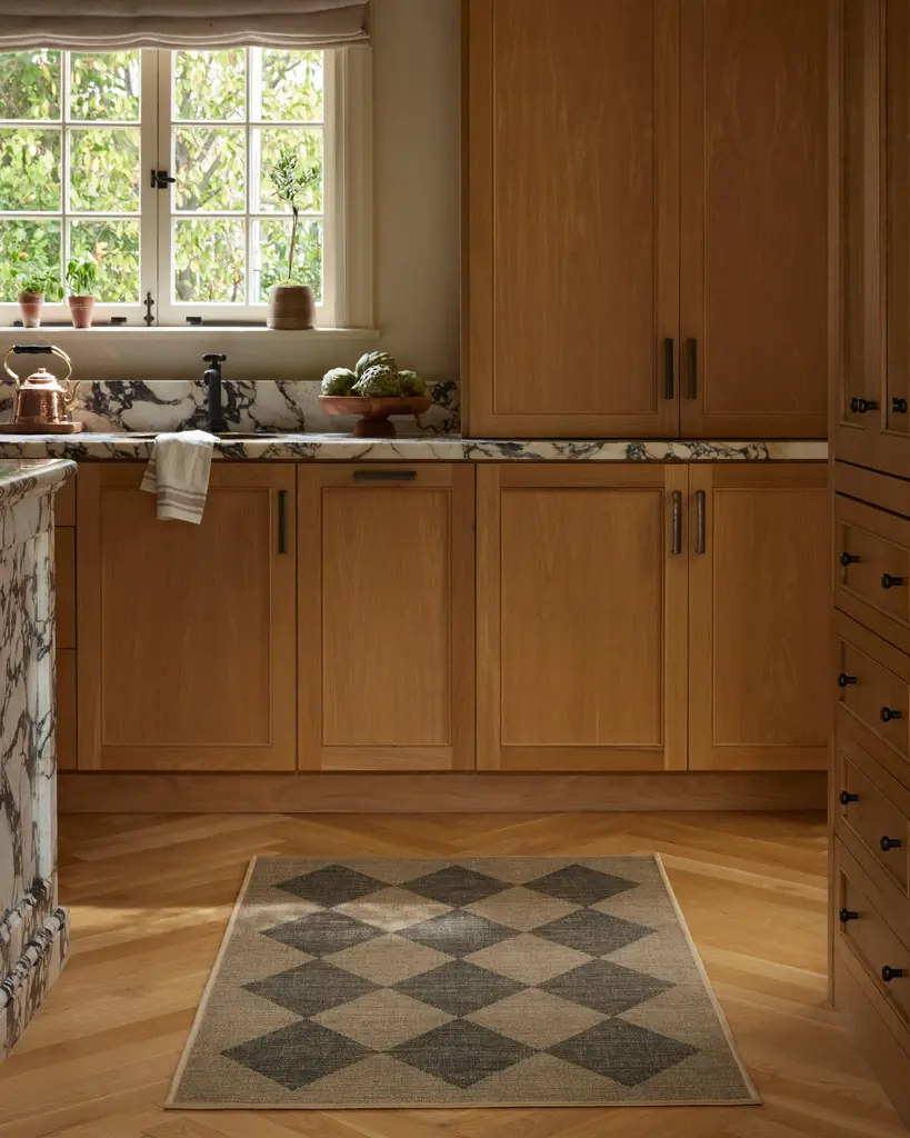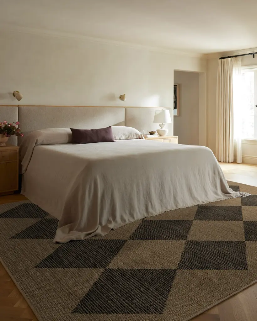 Redefine simplicity with our goop Salerno Soft Black Re-Jute Rug. Featuring an oversized, checkered diamond design, this harlequin style is modernized by a unique border that adds depth and dimension to the central motifs. Drawing color inspiration from natural earth tones, the charcoal elements blend seamlessly against a warm brown background. The woven jute-like material is made from recycled and virgin polyester, and polyurethane that won't shed or fray. Water-resistant, stain-resistant, and machine-washable.