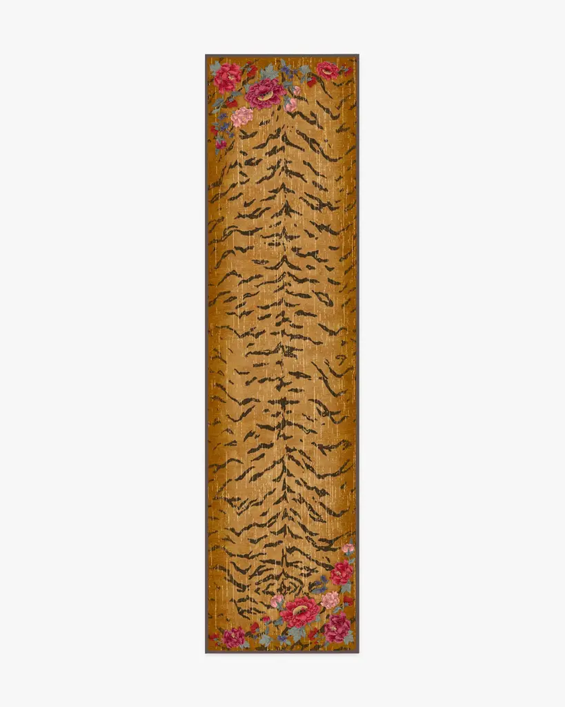 Inspired by Gracie's handpainted Tiger wallpaper, our Gracie Bengal Bloom Multicolor Rug features colorful floral motifs layered over a burnt orange tiger stripe pattern. A palette of magenta, red, berry, pink, indigo, and green pops beautifully against the charcoal stripes and gold highlights. Water-resistant, stain-resistant, and machine-washable. Rug colors may vary slightly according to your device and the lighting in your space.