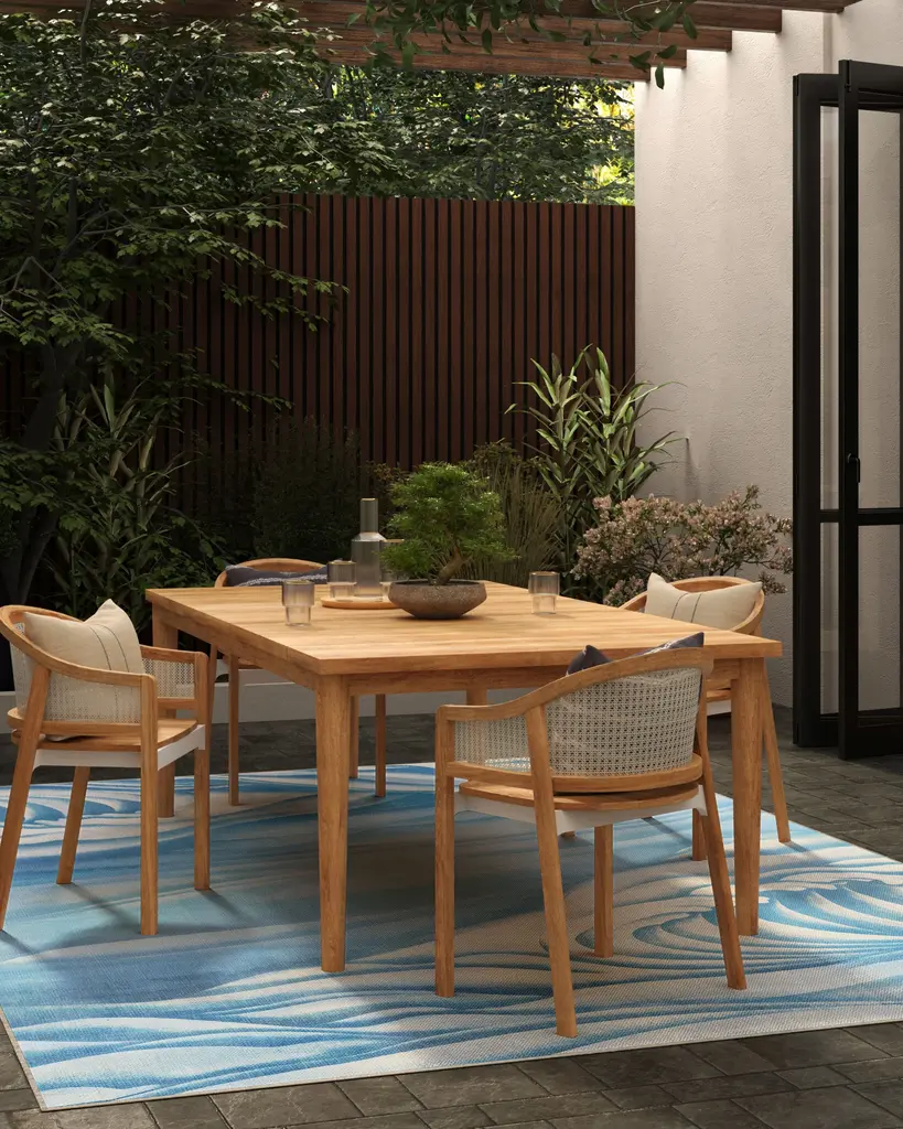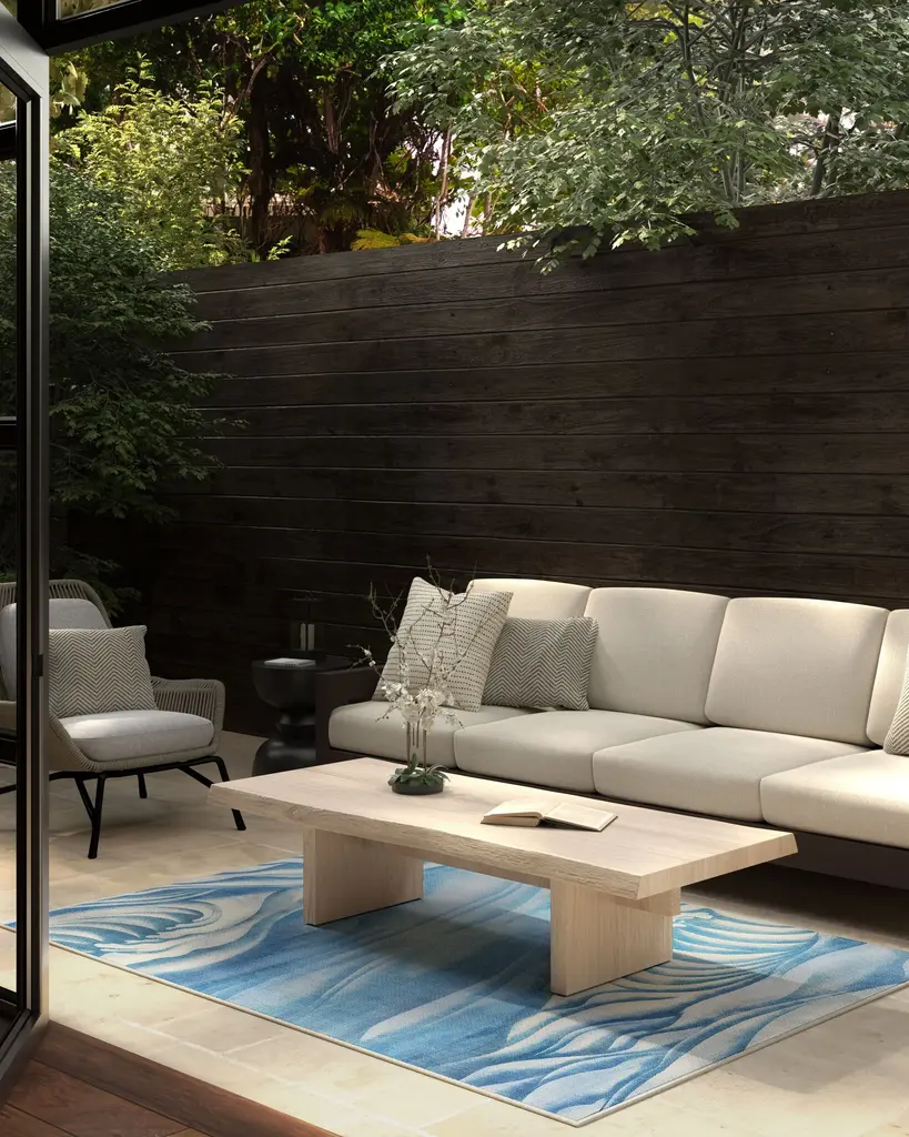 Inspired by stylized Japanese depictions of rising and falling waves, Gracie Outdoor Waves Soft Blue Rug features soft, flowing curves capped in ivory white. The antique feel of this rug is enhanced by the gradient of soft steel blues, creating a textured look. The extra-durable, machine-washable material is perfect for both outdoor and indoor use, especially high-traffic areas and those exposed to the elements. Rug colors may vary slightly according to your device and the lighting in your space.
