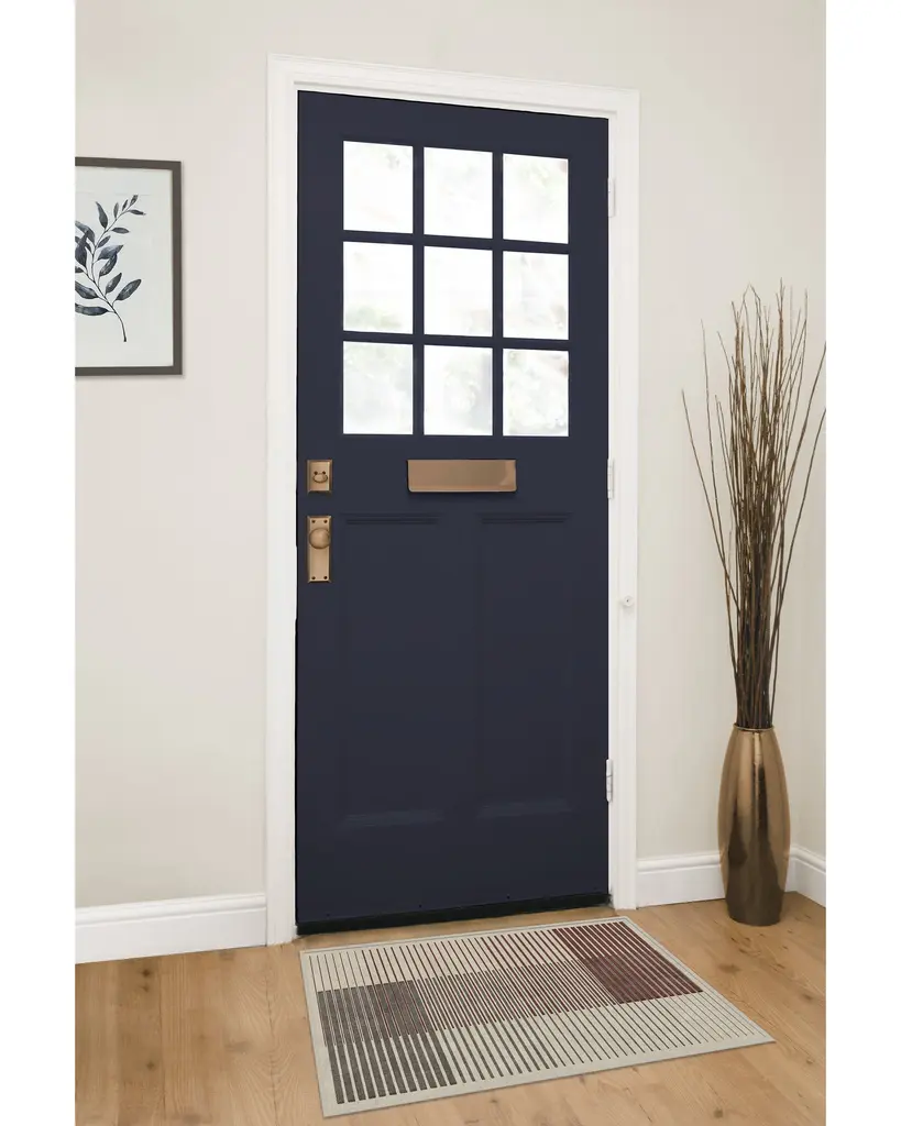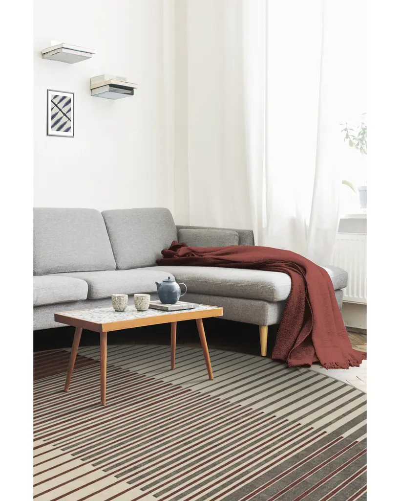 Gradasi Sumac Rug celebrates abstract expressionism and is inspired by artists Josef Albers and Bridget Riley. Overlapping lines, drawn in various line weights and tinted in burgundy red on ivory, create this rug's elegant ombre effect, giving it a modern and sophisticated appeal. Water-resistant, stain-resistant, and machine-washable. Rug colors may vary slightly according to your device and the lighting in your space.