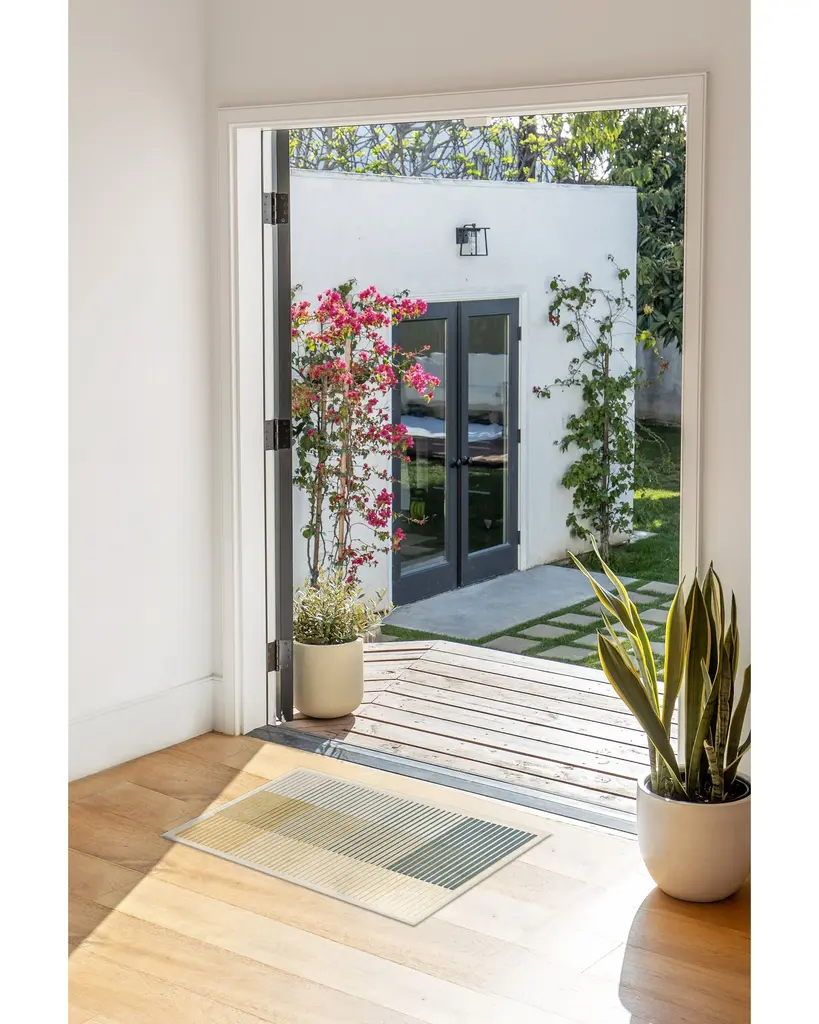 This Gradasi Teal Quartz Rug is a great way to infuse a unique pattern and color into your home. Featuring overlapping teal grey and coriander lines, drawn in various weights to mimic an ombre effect, this abstract art-inspired rug perfectly complements a modern minimalistic space. Water-resistant, stain-resistant, and machine-washable.