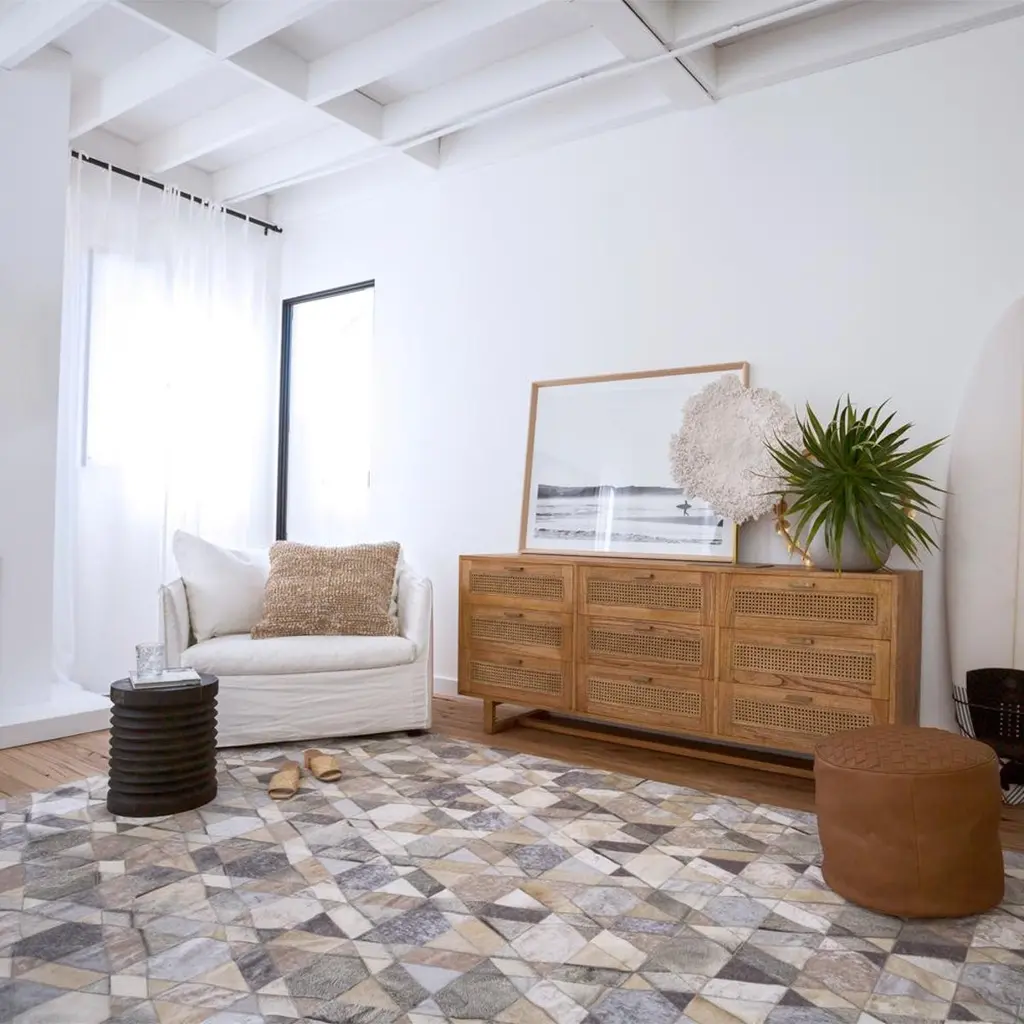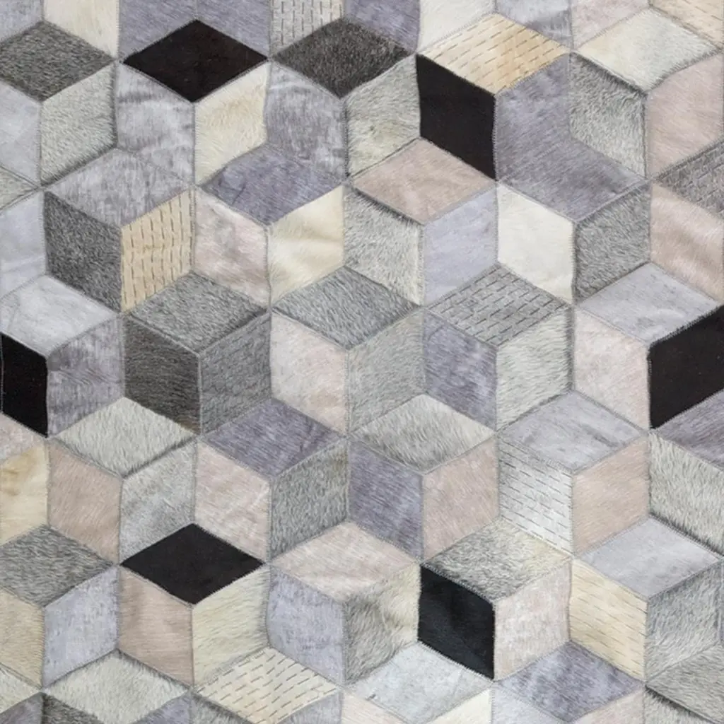 The elegant Selva rug artfully blends a mix of naturally colored premium cowhide with tonally dyed high-quality viscose. Selva’s stunning geometric pattern cohesively draws these mixed textiles together into a seamless patchwork of warm and inviting tones.The durability and quality of the Selva remain the same as the regular Art Hide range and the injection of the lush viscose not only looks incredibly striking but also creates a fabulous price point. Small measures 2 x 1.6 m (6’7” x 5’3”). Large measures 2 x 3 M (6’7” x 9’8”).This item can easily be customized to any color size or shape upon request.Art Hide rugs are usually made to order. Please allow 4-5 weeks for delivery.