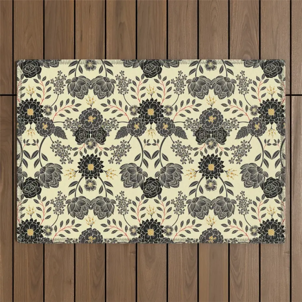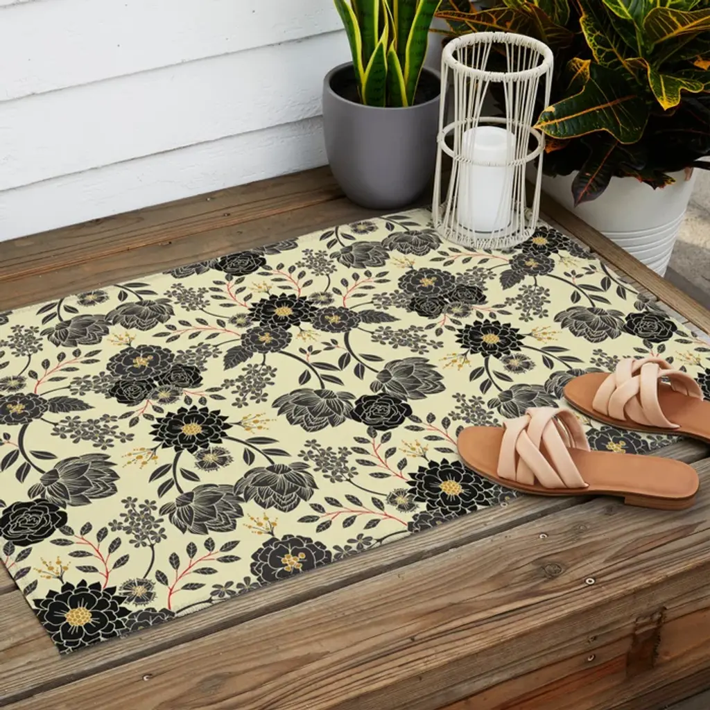 Gray, Black, Cream, Yellow & Red Sophisticated Floral Pattern Outdoor Rug