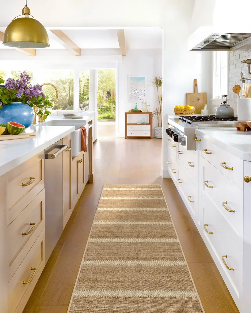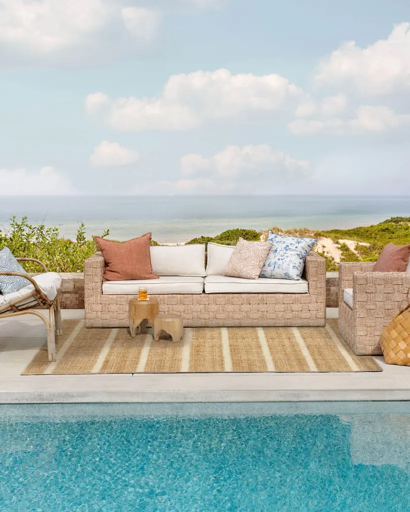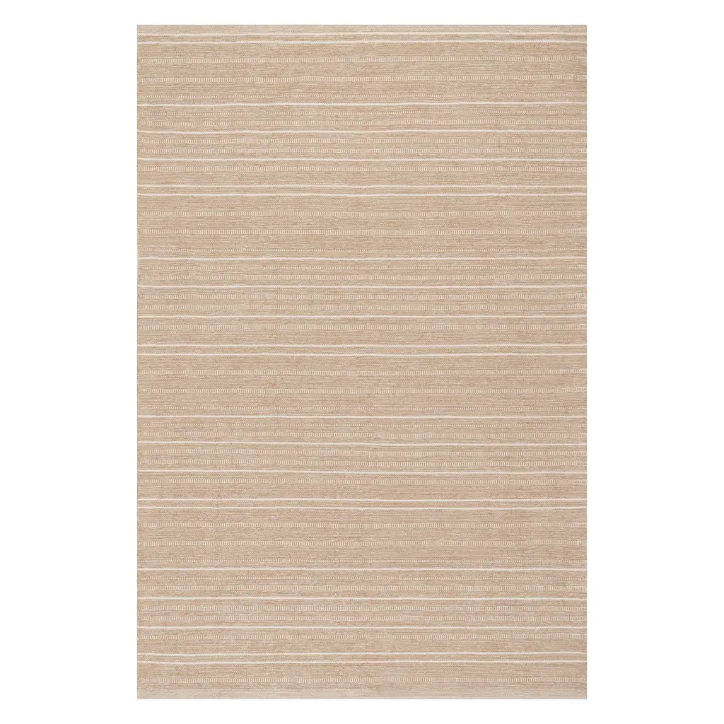 Sun-drenched and effortlessly cool. With palm-inspired stripes against a warm light brown background, the Malibu Rug brings laid-back luxury to any space. Natural jute-like detailing adds texture and earthy charm, indoors or out. Water-resistant, stain-resistant, and fully machine-washable. Colors may vary by device and lighting.