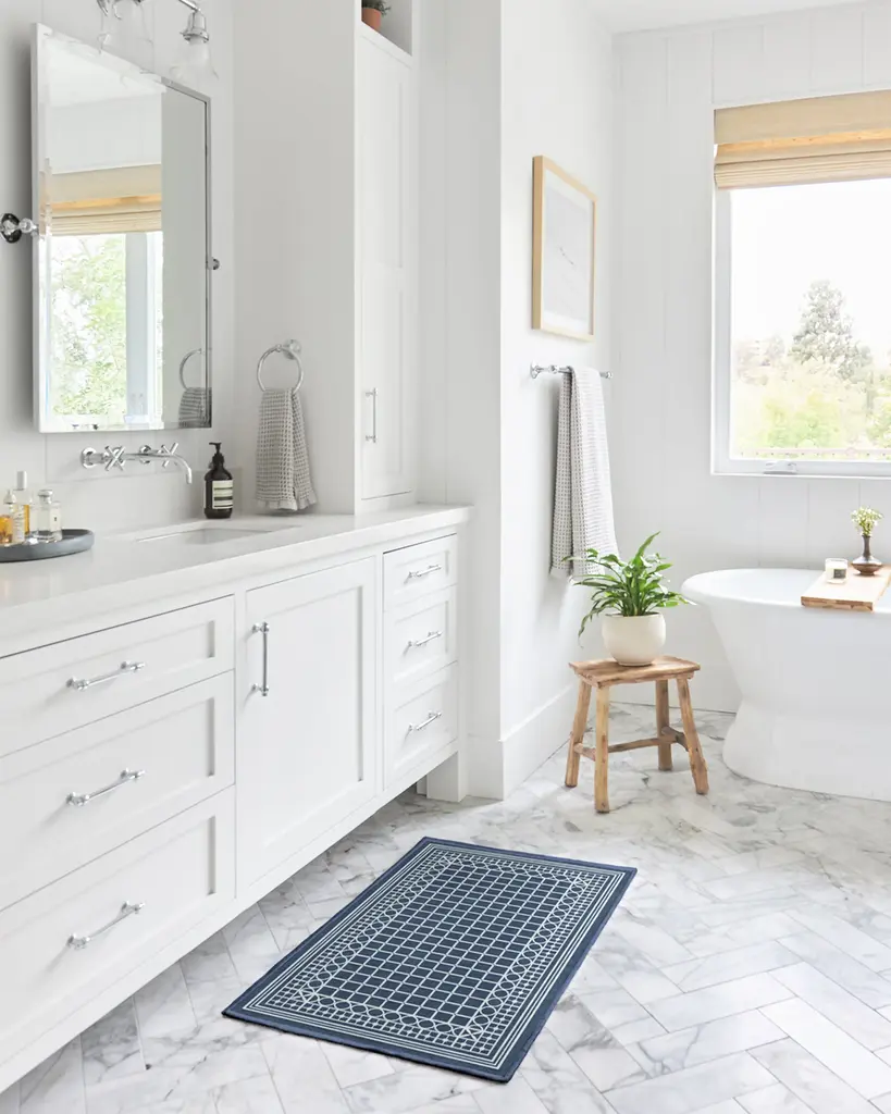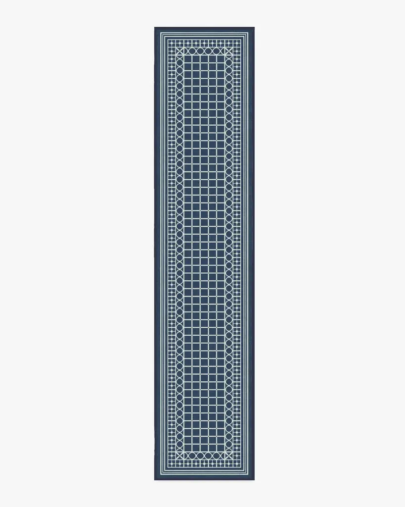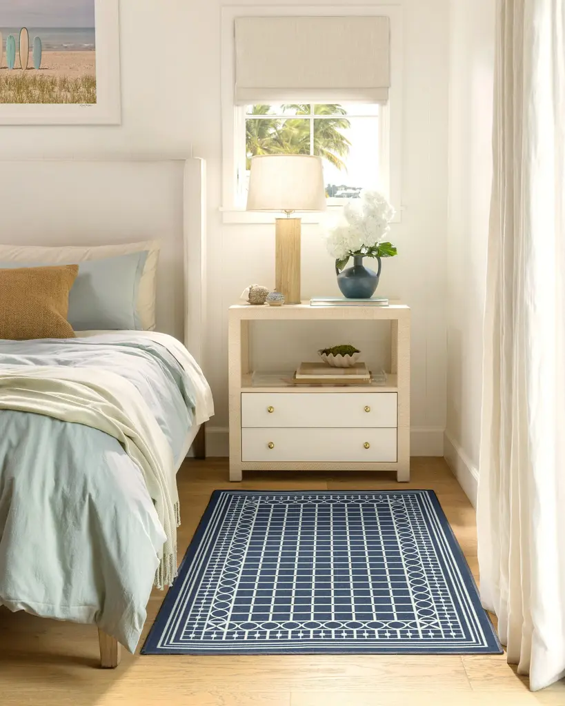 Vacation starts here. Inspired by breeze block patterns in Gray Malin’s coastal photography, the Palm Beach Rug brings seaside sophistication home. A rich navy background and crisp ivory motifs deliver timeless style with a bold, breezy edge. Water-resistant, stain-resistant, and fully machine-washable. Colors may vary by device and lighting.