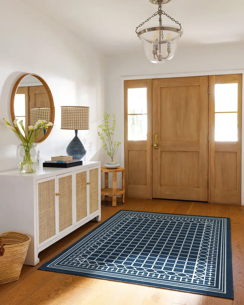 Vacation starts here. Inspired by breeze block patterns in Gray Malin’s coastal photography, the Palm Beach Rug brings seaside sophistication home. A rich navy background and crisp ivory motifs deliver timeless style with a bold, breezy edge. Water-resistant, stain-resistant, and fully machine-washable. Colors may vary by device and lighting.