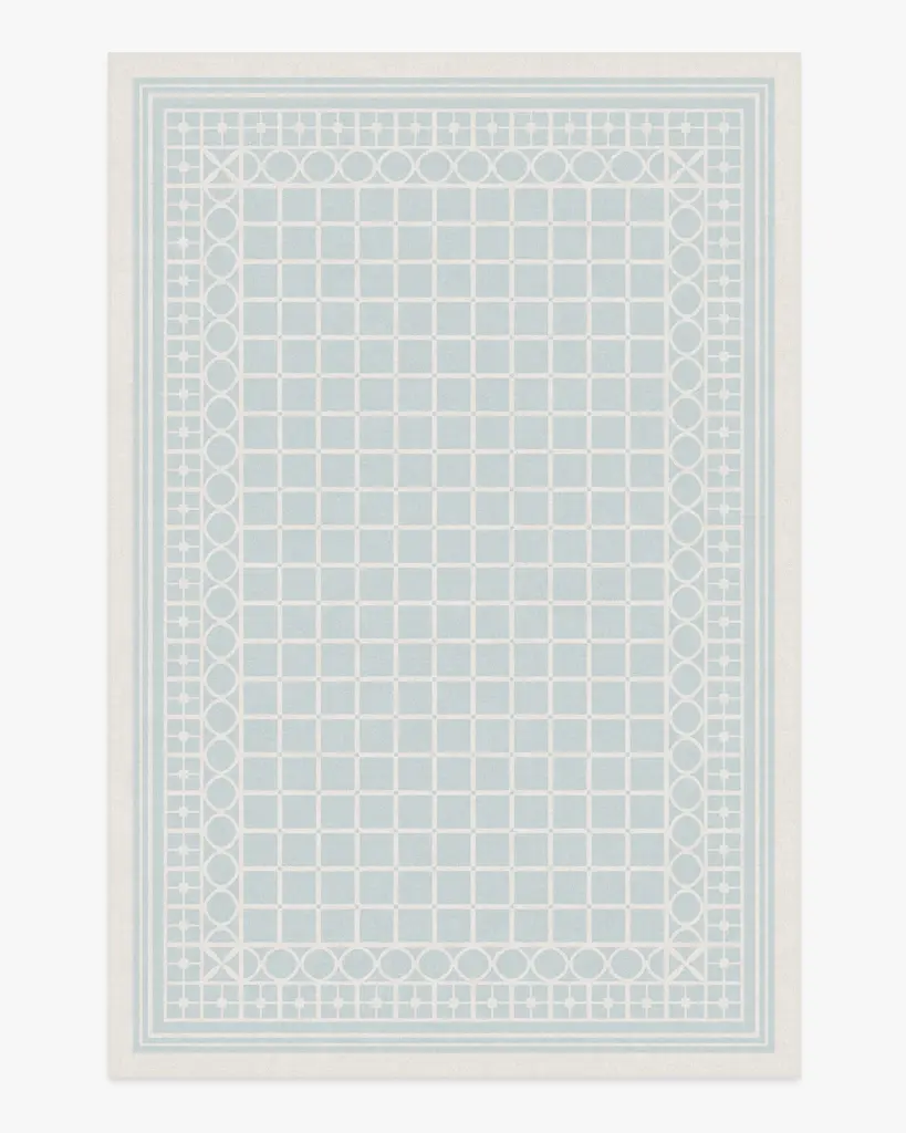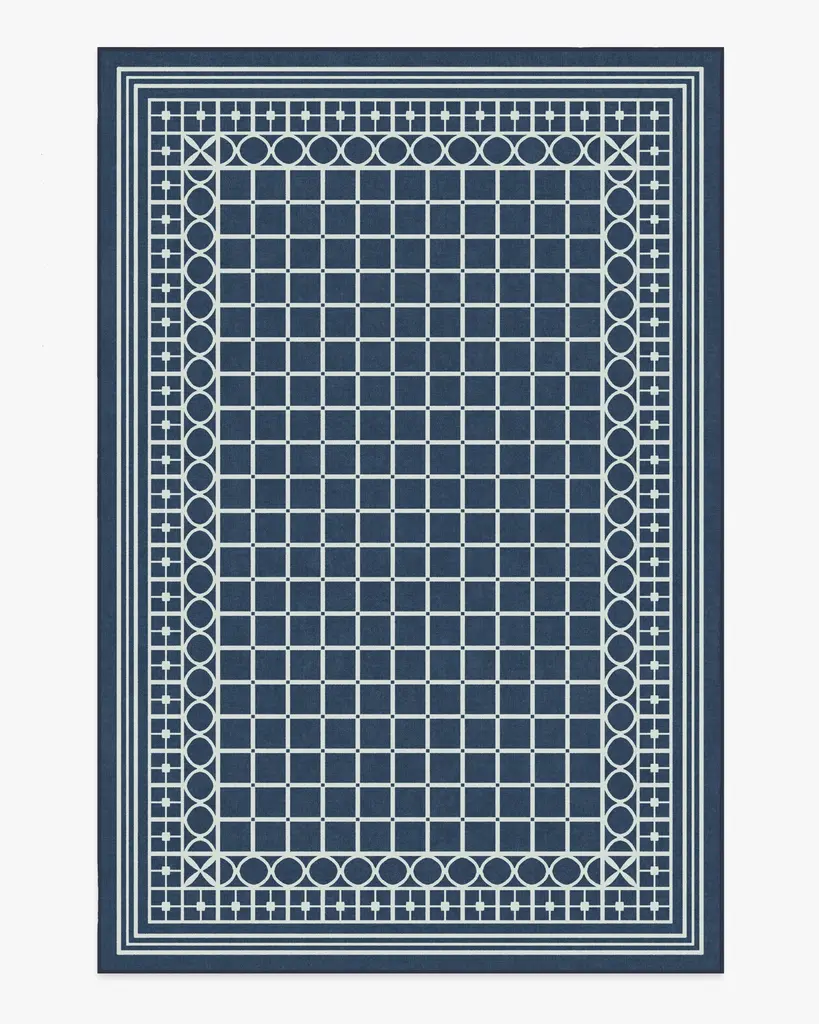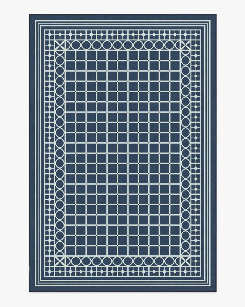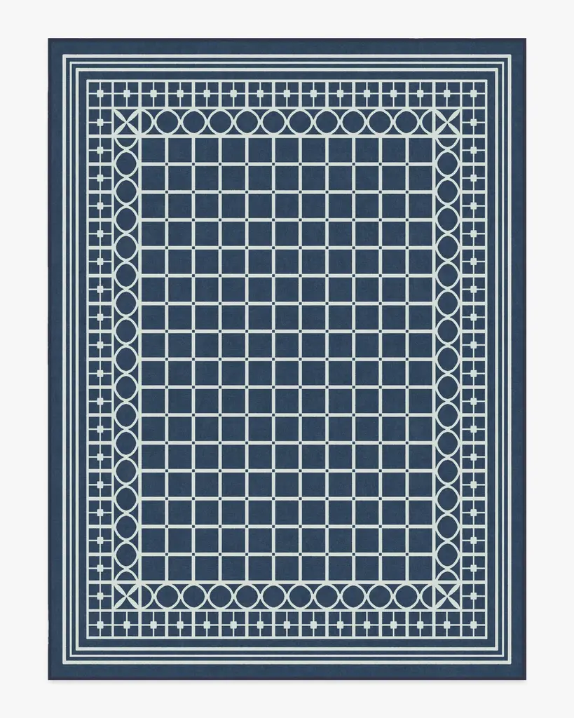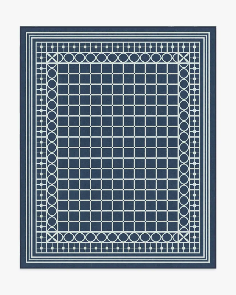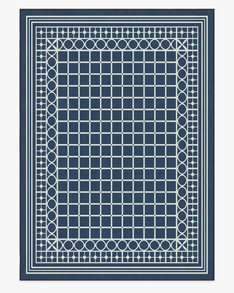 Vacation starts here. Inspired by breeze block patterns in Gray Malin’s coastal photography, the Palm Beach Rug brings seaside sophistication home. A rich navy background and crisp ivory motifs deliver timeless style with a bold, breezy edge. Water-resistant, stain-resistant, and fully machine-washable. Colors may vary by device and lighting.