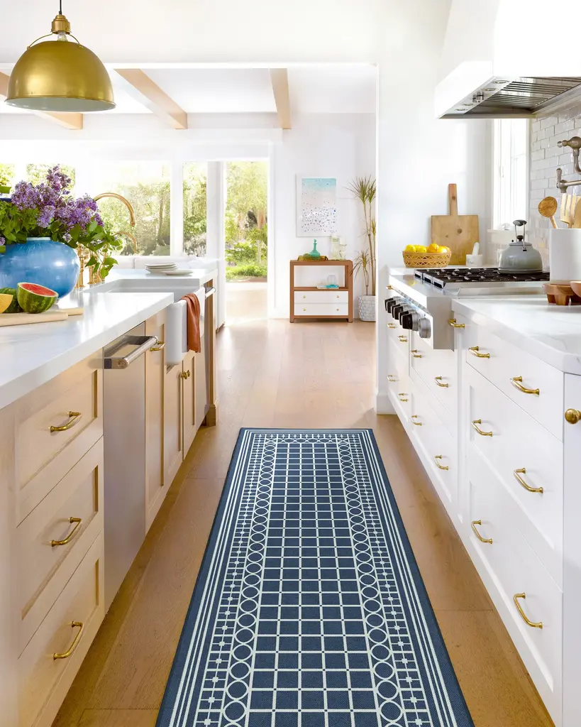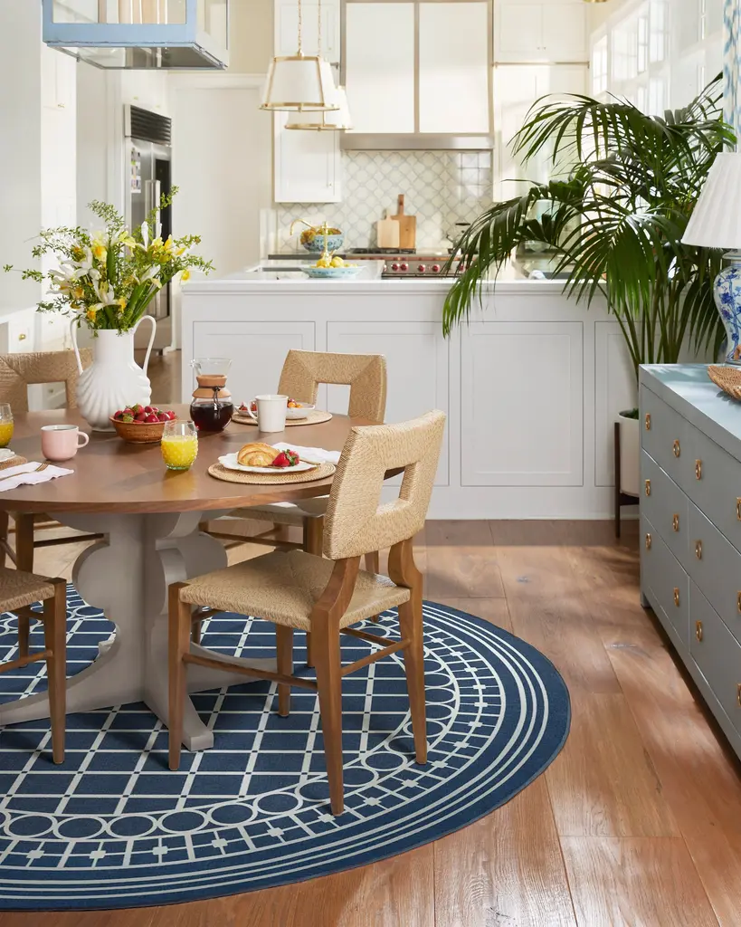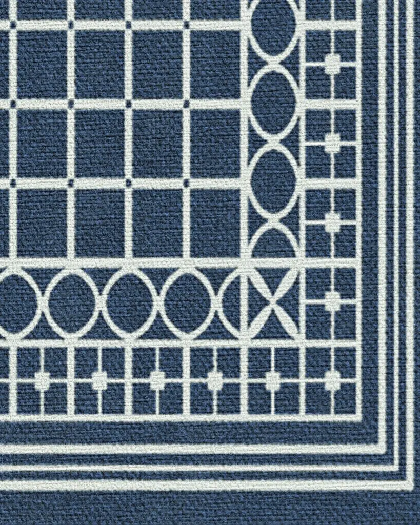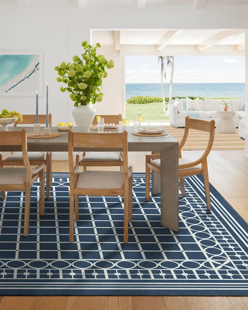 Vacation starts here. Inspired by breeze block patterns in Gray Malin’s coastal photography, the Palm Beach Rug brings seaside sophistication home. A rich navy background and crisp ivory motifs deliver timeless style with a bold, breezy edge. Water-resistant, stain-resistant, and fully machine-washable. Colors may vary by device and lighting.