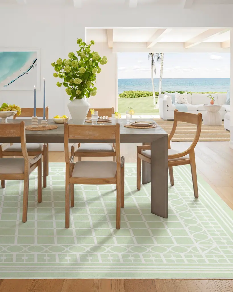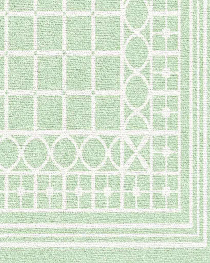 Vacation starts here. With breeze block motifs pulled from Gray Malin’s travel photography, the sage green Palm Beach Rug brings laid-back elegance to your space. Crisp ivory details complete the look for that just-checked-in feeling. Water-resistant, stain-resistant, and fully machine-washable. Colors may vary by device and lighting.