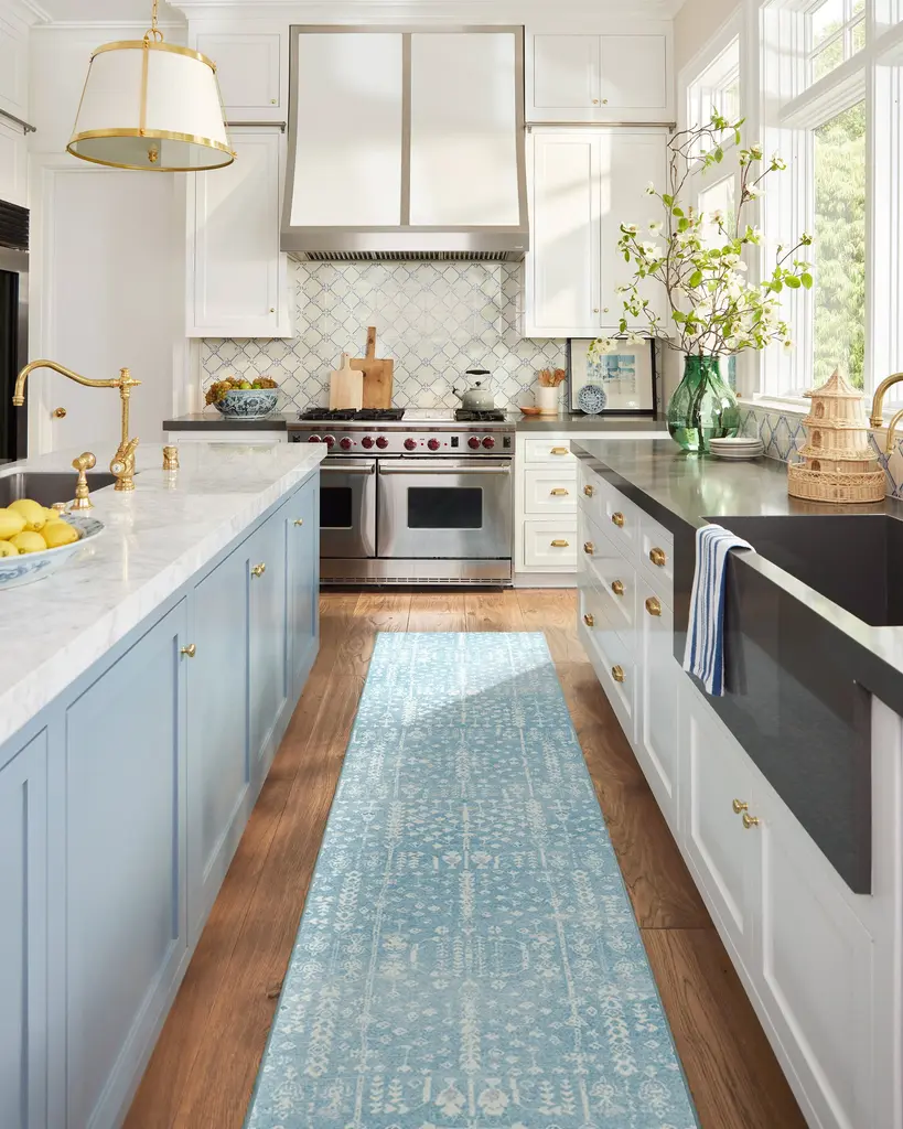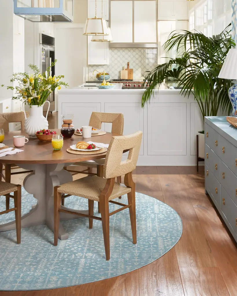 A fresh spin on classic Persian design, the Palmetto Rug features hand-drawn motifs and a subtly distressed repeat pattern. Set on a soft blue background, ivory details mingle with playful pops of buttercream, pink, and teal for a sun-washed, airy elegance. Water-resistant, stain-resistant, and fully machine-washable. Colors may vary by device and lighting..