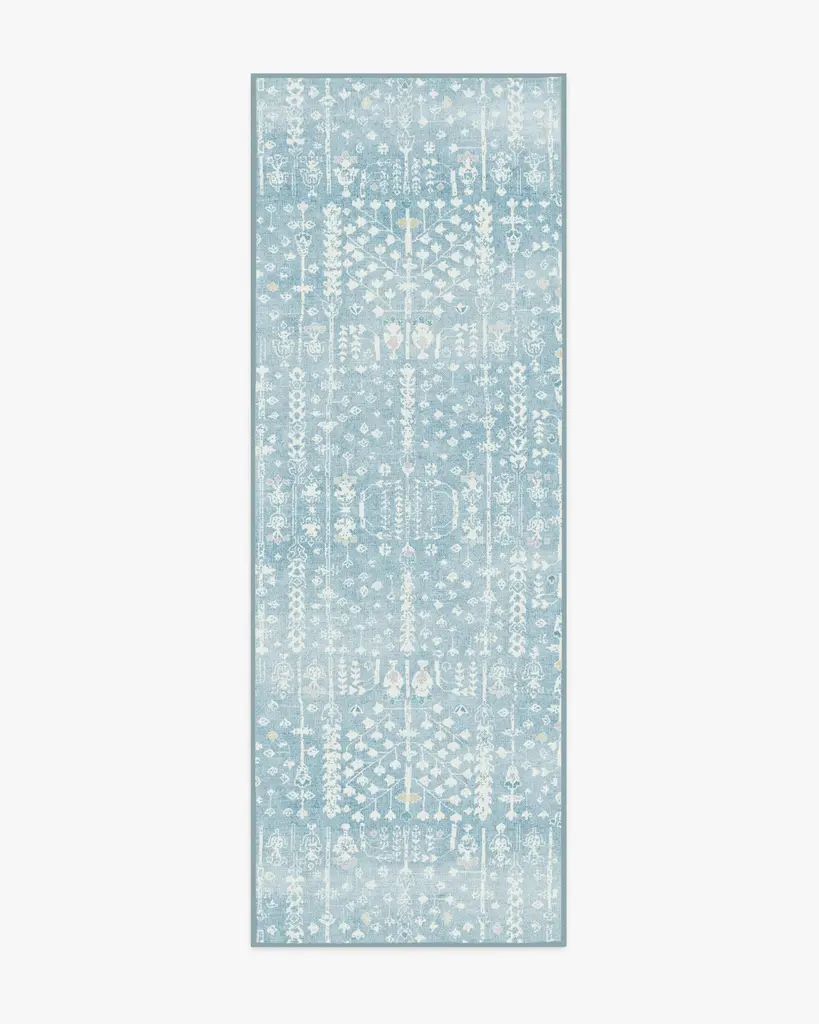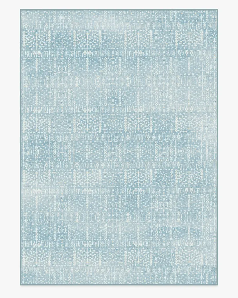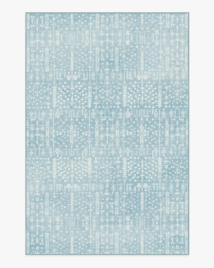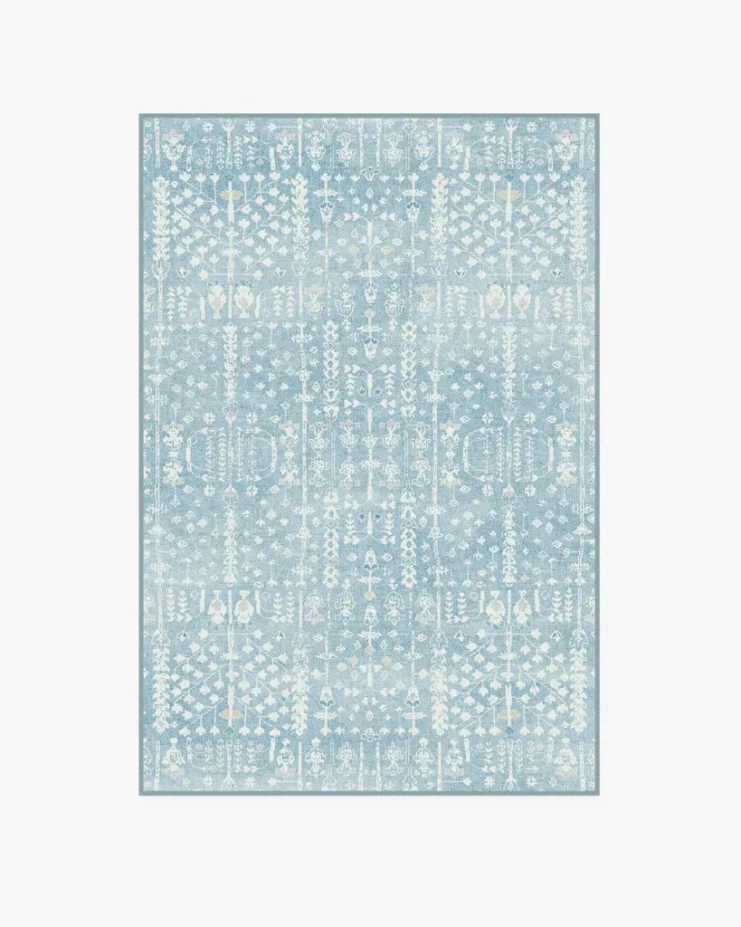 A fresh spin on classic Persian design, the Palmetto Rug features hand-drawn motifs and a subtly distressed repeat pattern. Set on a soft blue background, ivory details mingle with playful pops of buttercream, pink, and teal for a sun-washed, airy elegance. Water-resistant, stain-resistant, and fully machine-washable. Colors may vary by device and lighting..