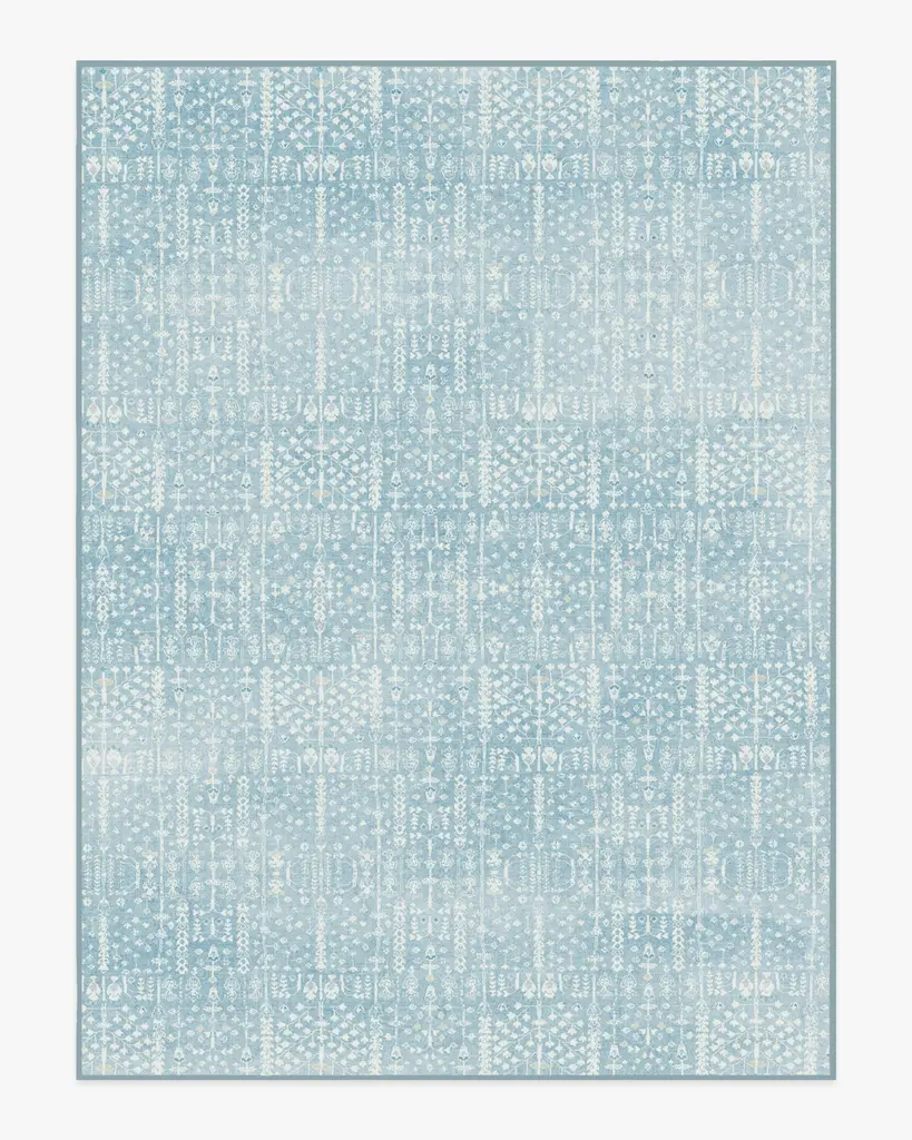 A fresh spin on classic Persian design, the Palmetto Rug features hand-drawn motifs and a subtly distressed repeat pattern. Set on a soft blue background, ivory details mingle with playful pops of buttercream, pink, and teal for a sun-washed, airy elegance. Water-resistant, stain-resistant, and fully machine-washable. Colors may vary by device and lighting..