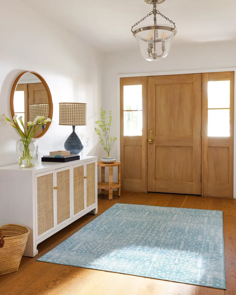 A fresh spin on classic Persian design, the Palmetto Rug features hand-drawn motifs and a subtly distressed repeat pattern. Set on a soft blue background, ivory details mingle with playful pops of buttercream, pink, and teal for a sun-washed, airy elegance. Water-resistant, stain-resistant, and fully machine-washable. Colors may vary by device and lighting..