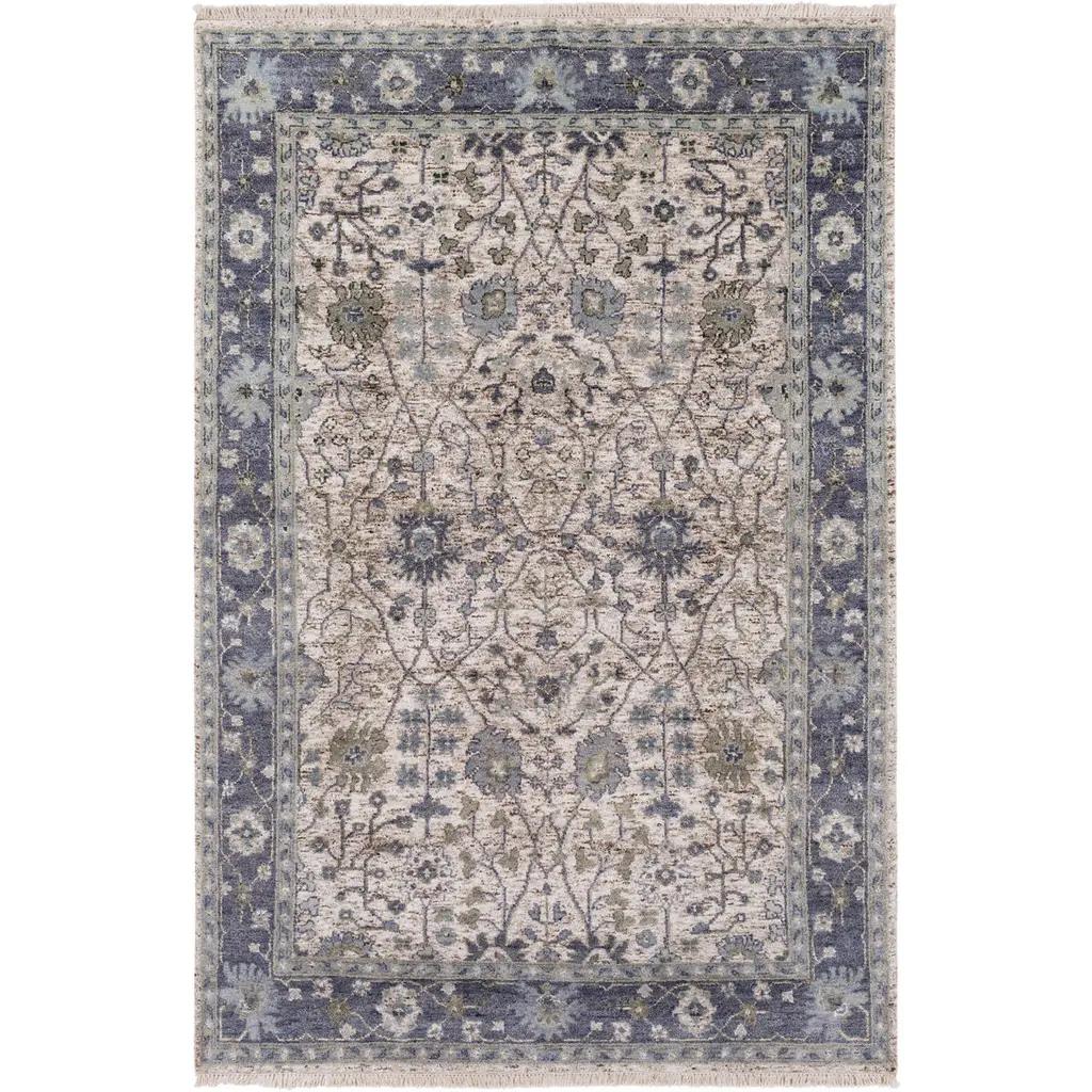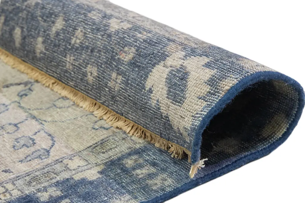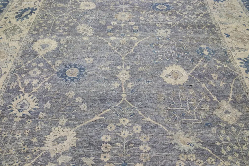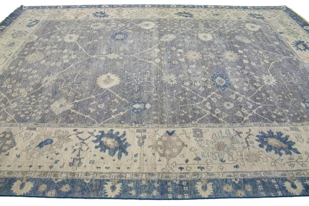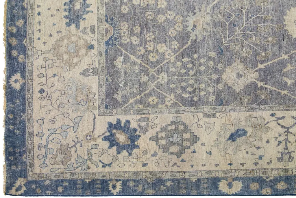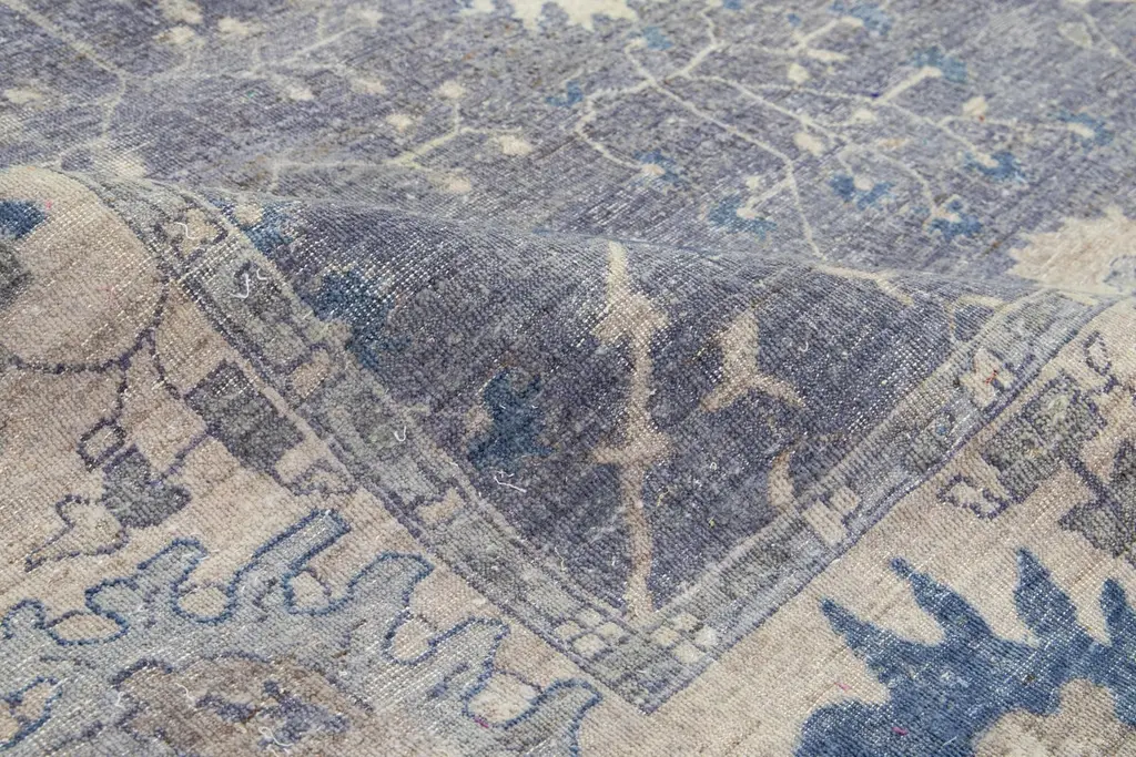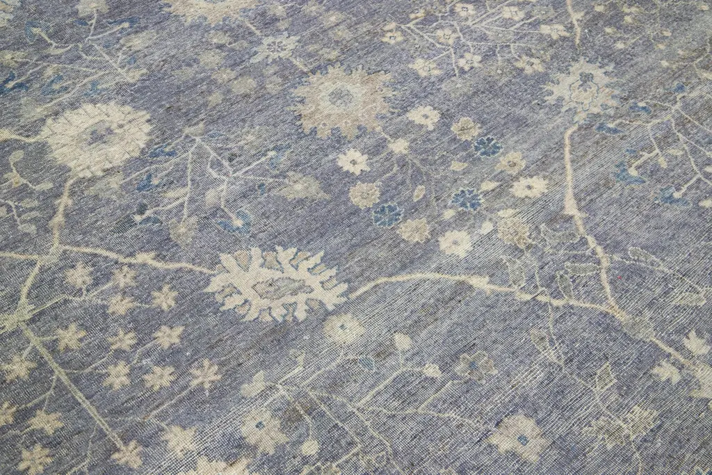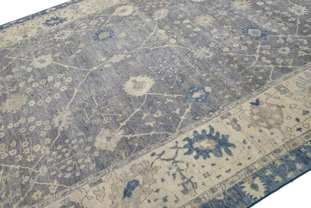 Apadana's Artisan Line is an antique rug reimaging with an elegant way to inject a striking antique aesthetic into a space. This line of rugs is decidedly unique and reimagines what an antique rug look can be. Every single piece from our Artisan line is painstakingly woven by hand.This custom rug features a gorgeous all-over floral design with a gray color field with beige and blue accent colors. This rug measures 9'9" x 14'1". Our rugs are professionally cleaned before shipping.