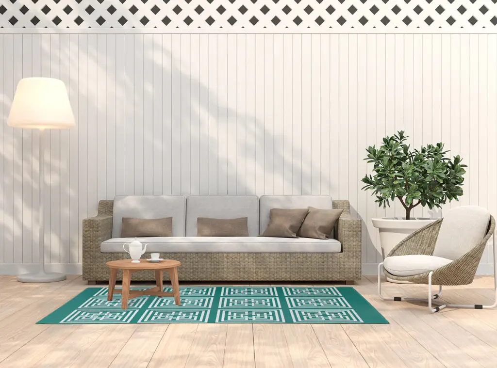 Create a cool coastal environment in your home with a Greek New Key Indoor/outdoor Rug from the Nantucket Collection. Everyone will delight in the space defining design brought to your porch, patio, kitchen, or bathroom by this area rug. The artistic and colorful design is printed on a soft polyester base with a skid resistant backing, making it a perfect way to add color, flare and personality to any indoor or outdoor space. To clean, use a mild soap and lay flat to dry.
