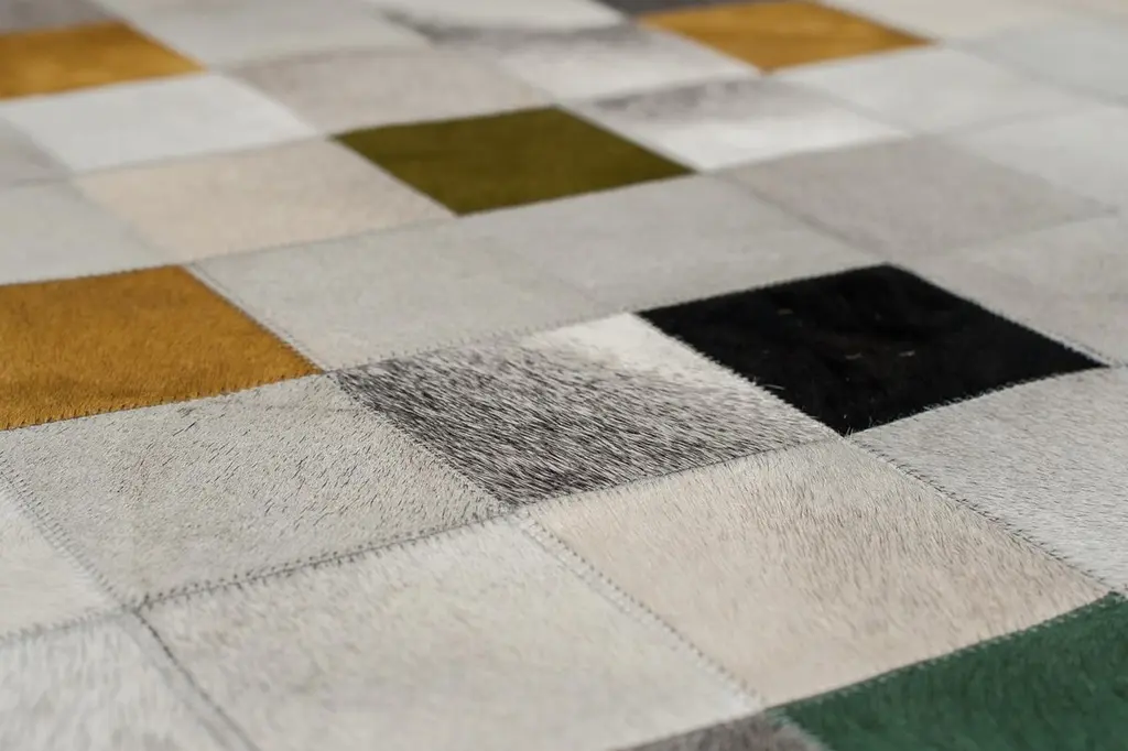 Green, Gray, Mustard Falling Squares Customizable Cowhide Area Floor Rug Large