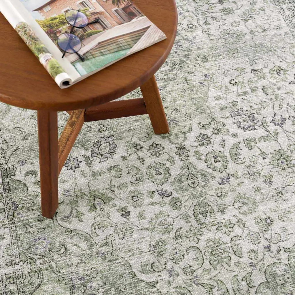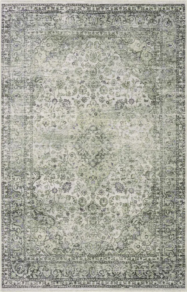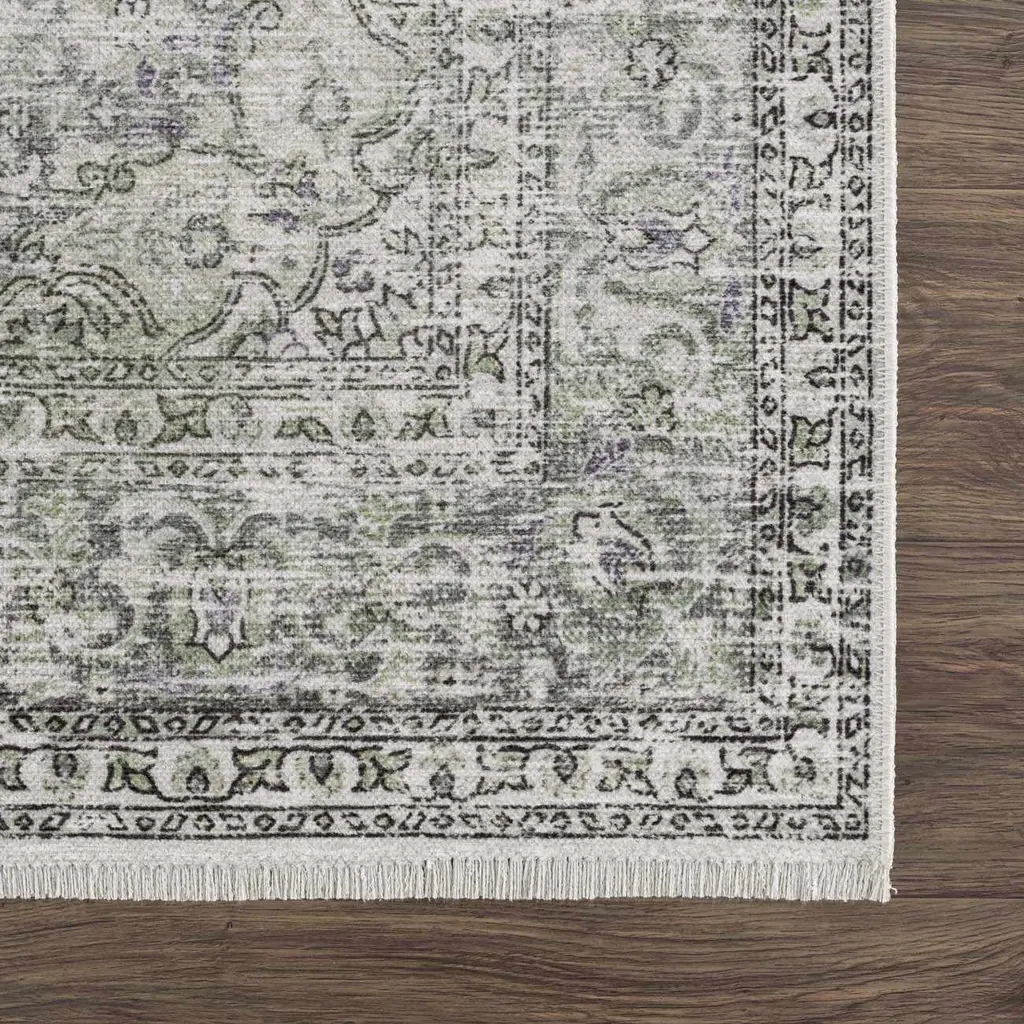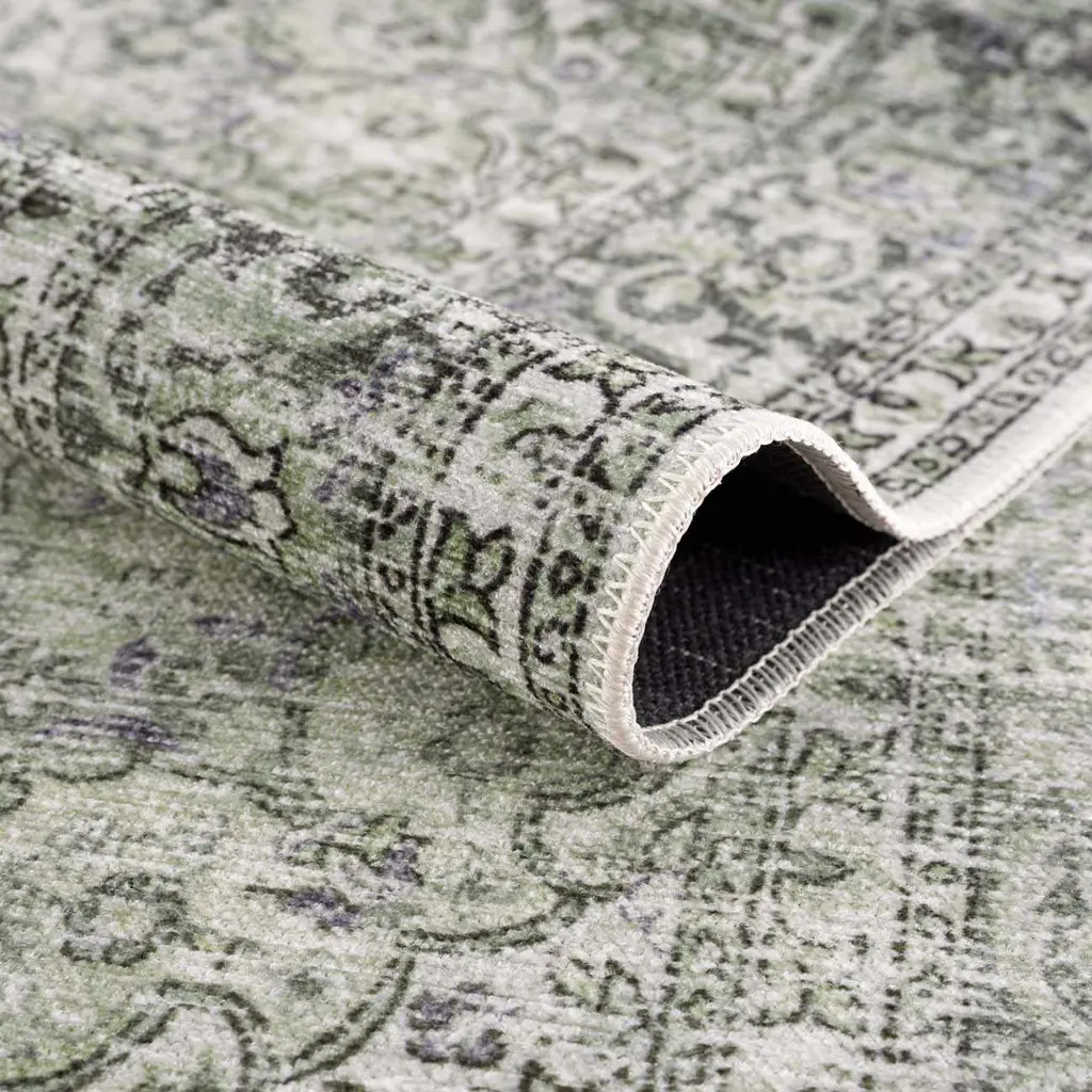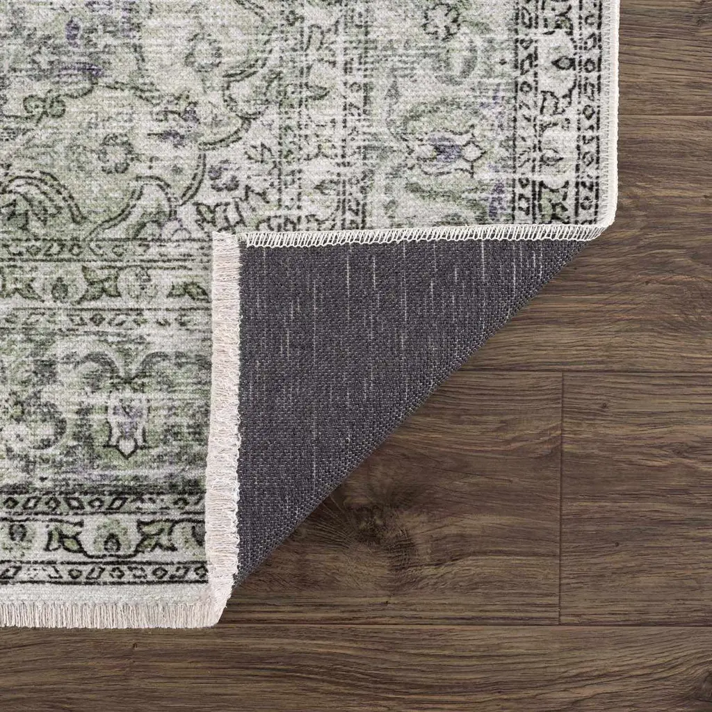 Brand: Hauteloom Collection: Cristy Colors: Cream, Olive Construction: Machine Printed Material: 100% Polyester Pile: No Pile Styles: Traditional Backing: Rubber Machine Washable: Yes Made In: Turkey Thickness: 0.16" Price Range: $$$$$ (Most Affordable)