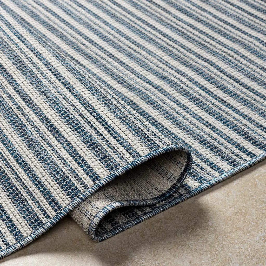 Collection: Udom Colors: Ivory, Pale Blue, Navy Construction: Machine Woven Material: 100% Polypropylene Pile: No Pile Styles: Contemporary Outdoor Safe: Yes Made In: Turkey Thickness: 0.16" Price Range: $$$$$ (Most Affordable)