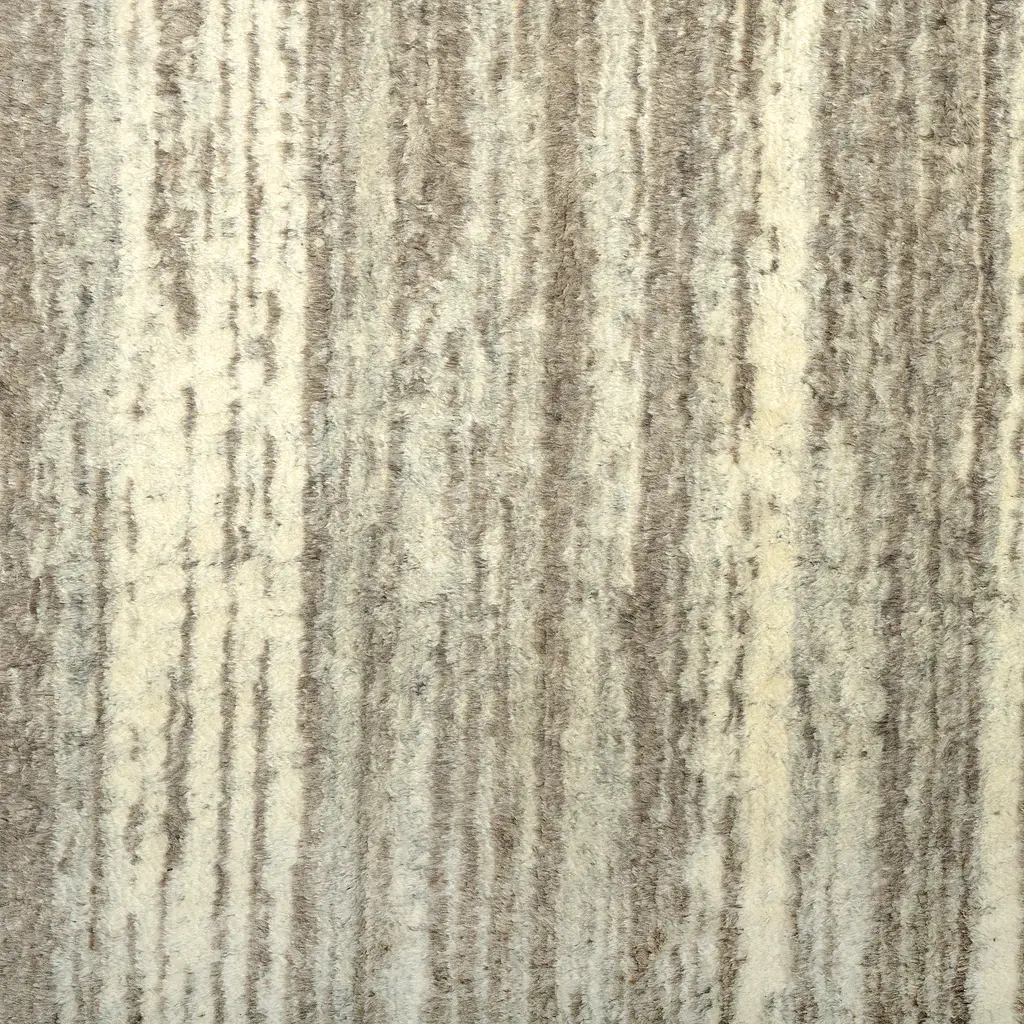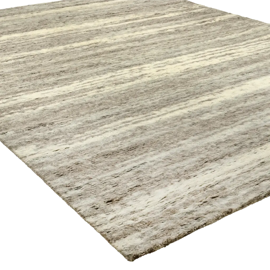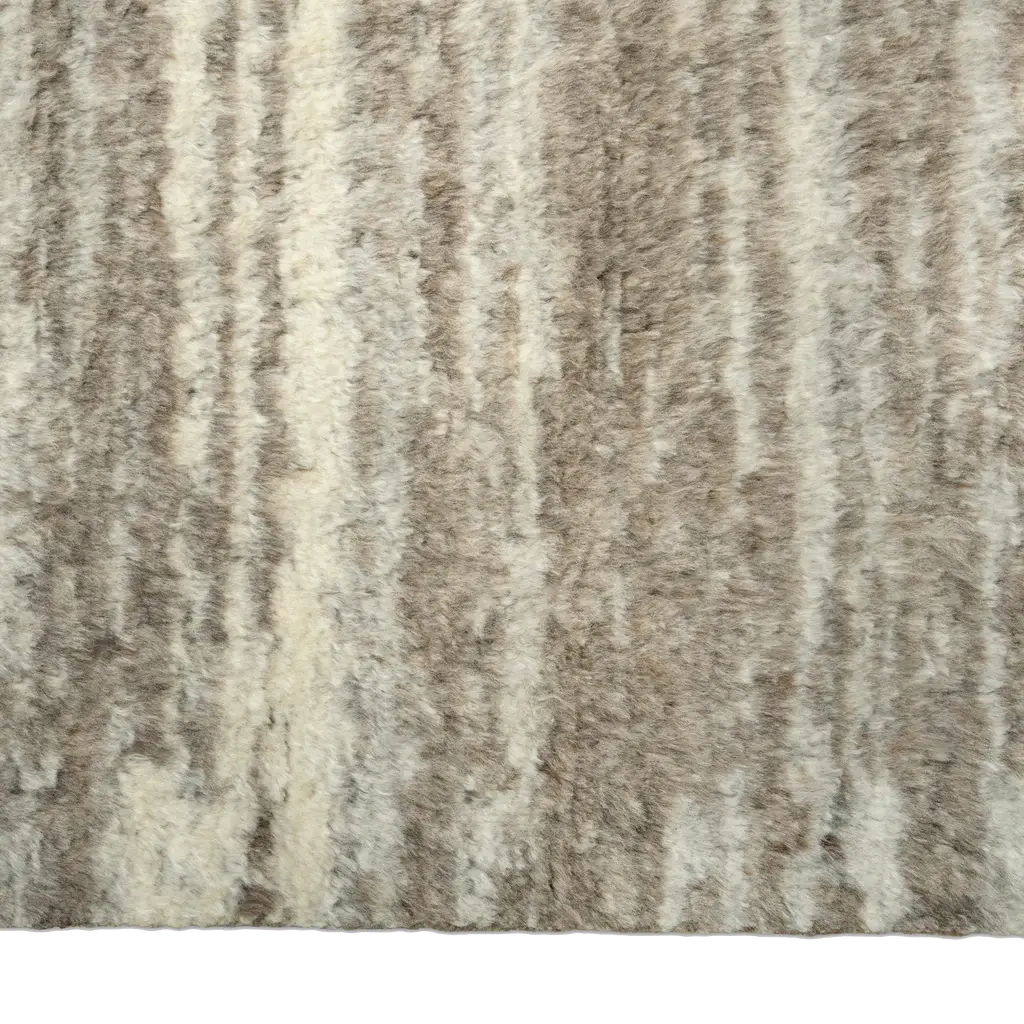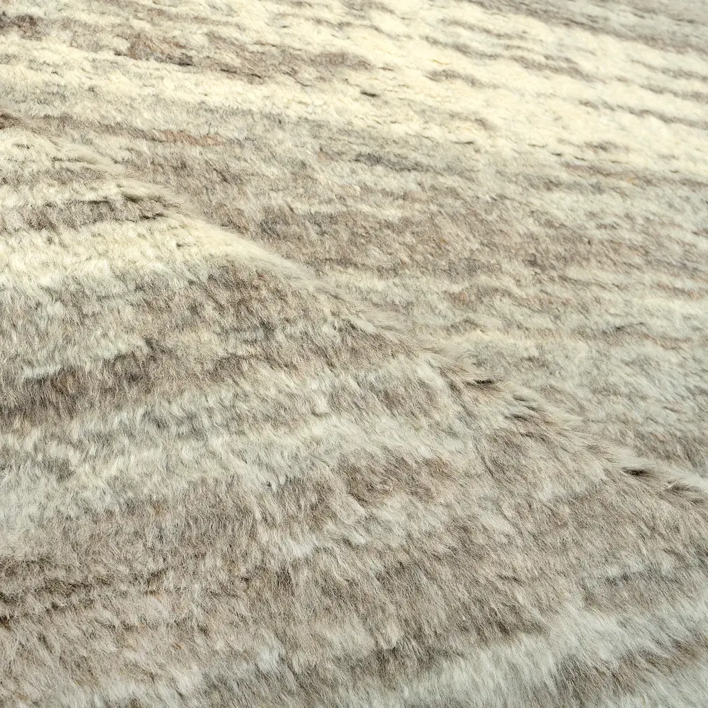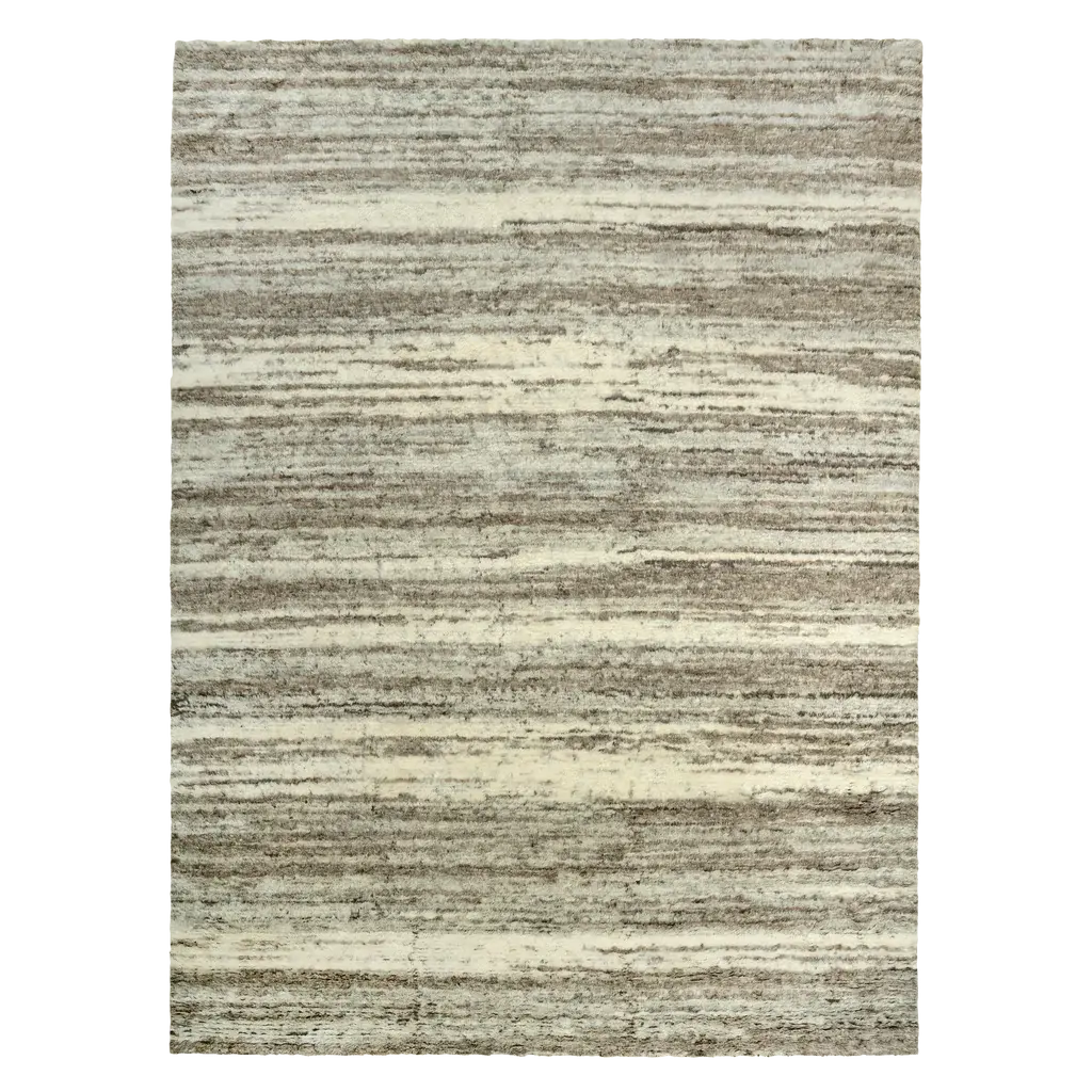 This Grey Striped Textured Moroccan Wool Rug 10' x 14' is hand-knotted from Mongolian wool by expert artisans helping preserve the cultural traditions of Moroccan rug making. This plush rug features a high-low abstract striped pattern in ivory, beige, and grey tones. For centuries, Mongolian wool rugs have served as a durable foundation material for exceptional insulation for warmth in the winter and cooling in the summer. The strong fibers can withstand daily use in your most frequented spaces.
