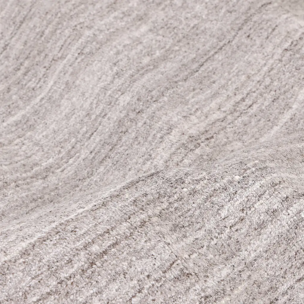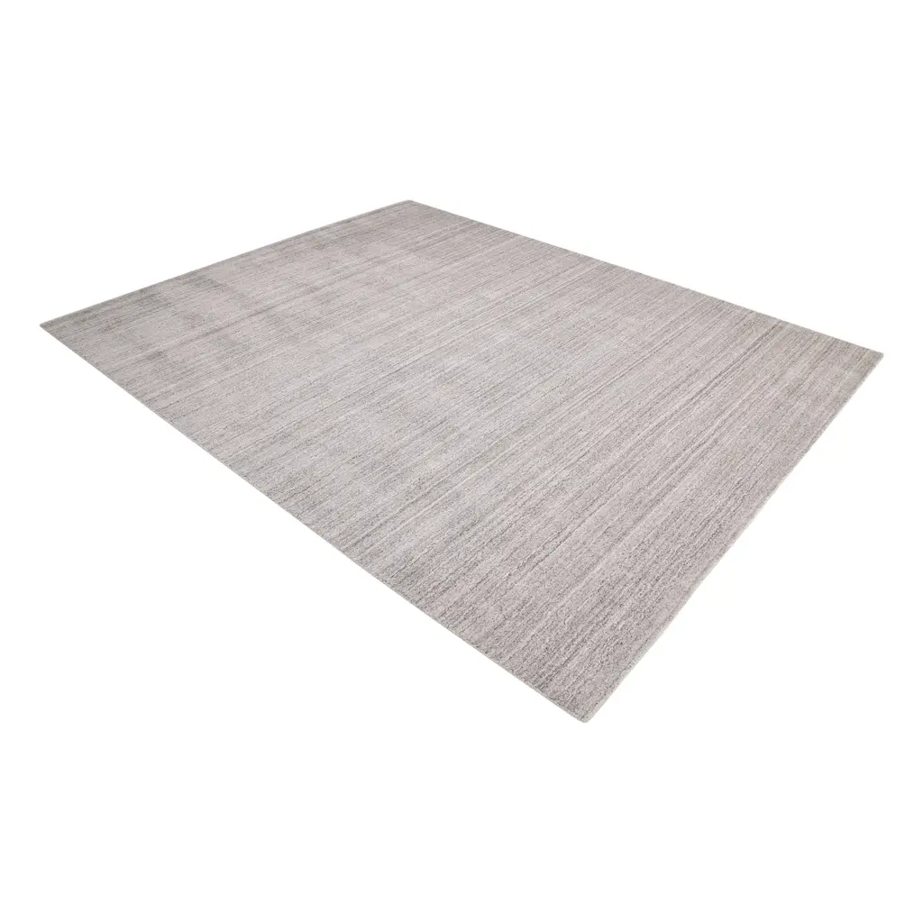 This Grey Solid Wool Art Silk Blend rug from India is a minimalist beauty. Light grey with a subtle stripe pattern, hand knotted for quality. Create a neutral, elegant space with this high end, versatile piece.