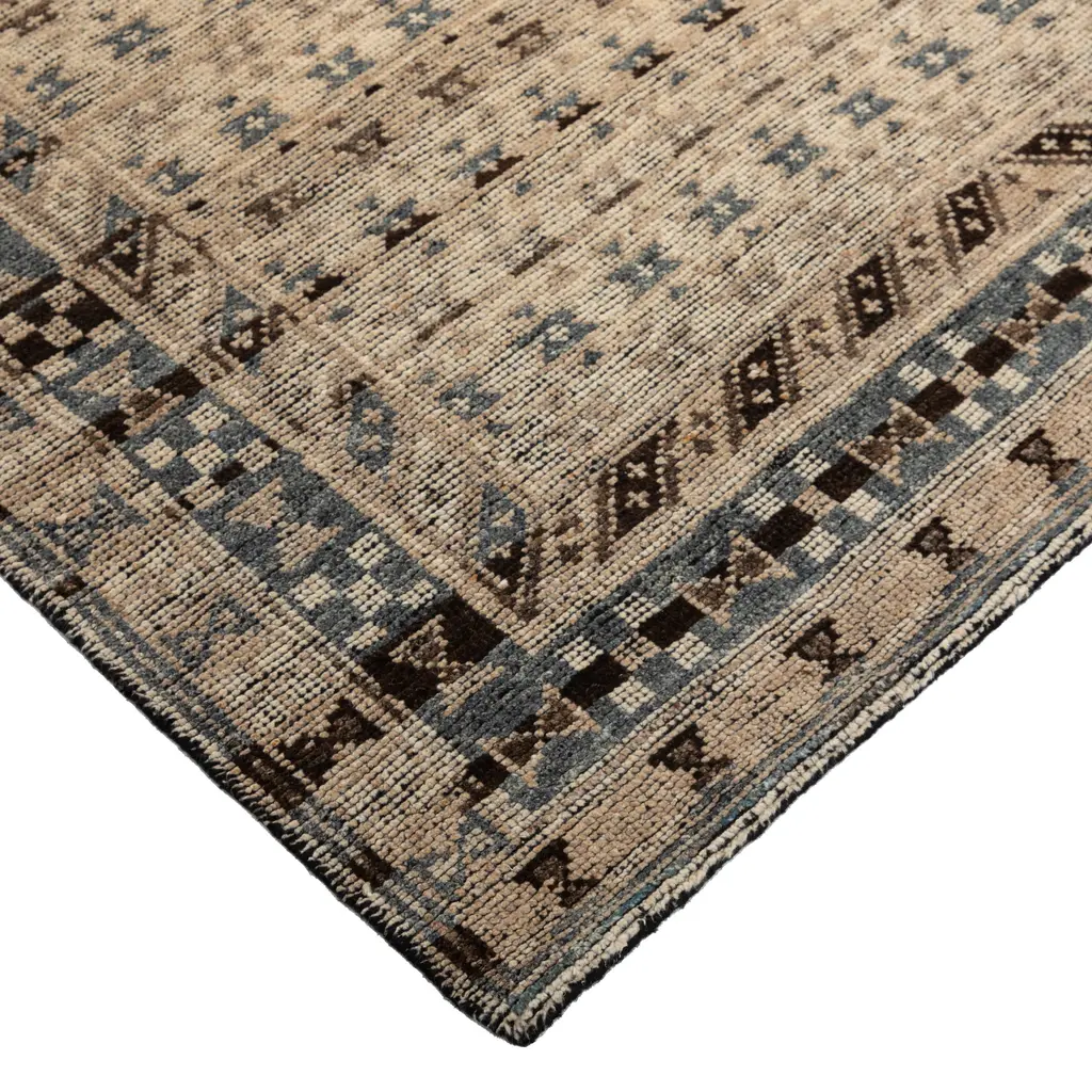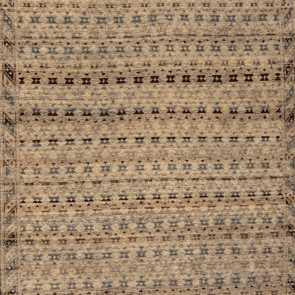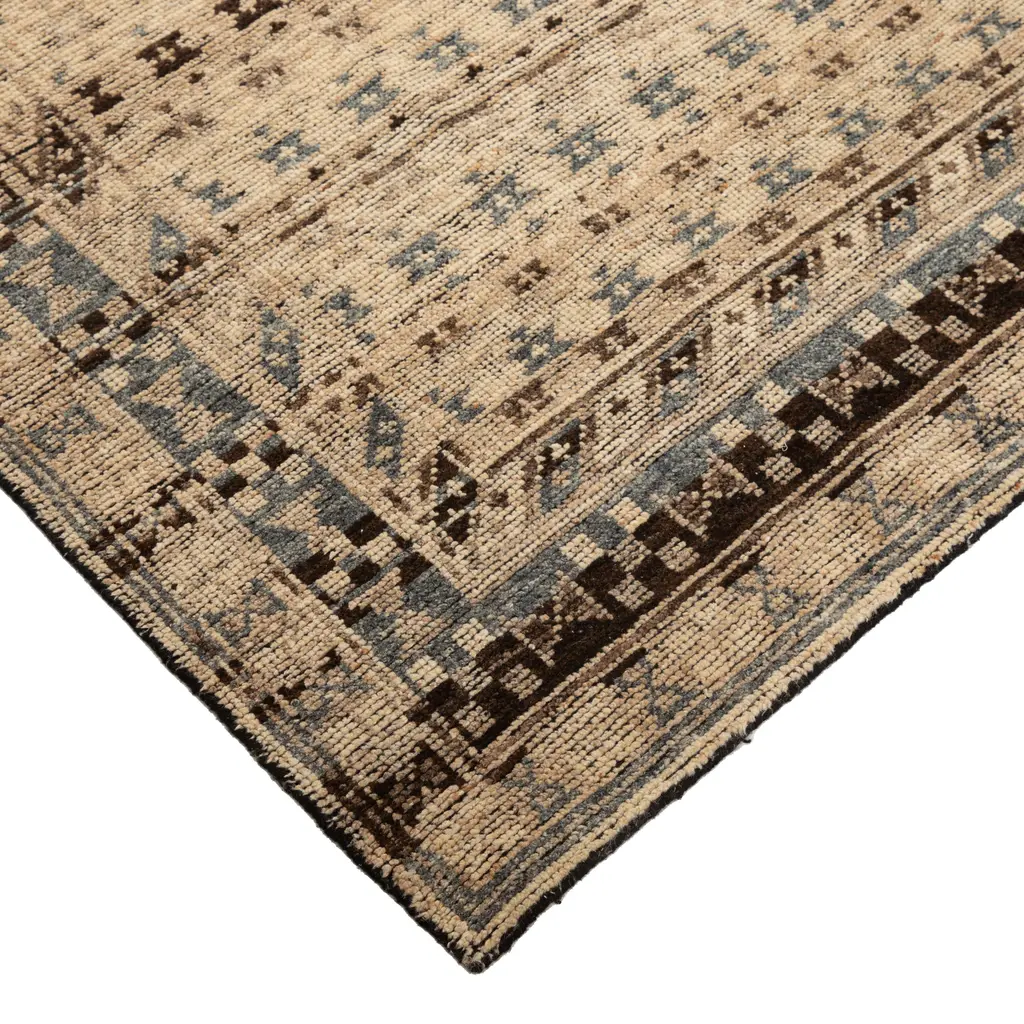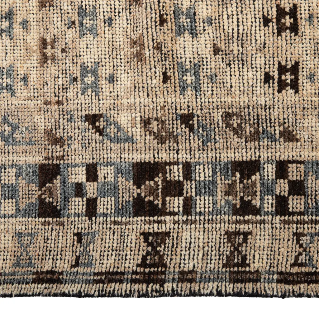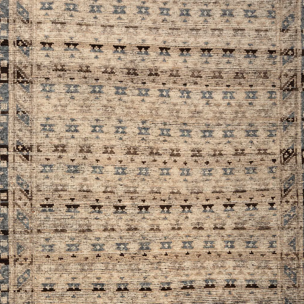 This Grey Traditional Wool Rug measures 6' x 9', offering a blend of traditional design and natural materials. Crafted from durable wool, this area rug originates from India, providing an authentic aesthetic suitable for various home decors. The rug features a muted grey and beige base, providing a versatile foundation for its pattern. Its central field is detailed with rows of small, repeating geometric motifs, including stylized crosses and triangles, rendered in subtle shades of light blue, grey, and dark brown. A multi-layered border frames the design. This border integrates alternating patterns, such as small checkerboard squares, elongated geometric shapes, and repeating 'X' motifs, all contributing to its distinct traditional character. Constructed from 100% wool, this rug provides natural insulation and a soft texture underfoot. Wool is known for its resilience and ability to withstand daily wear, making it a practical choice for high-traffic areas like living rooms, dining rooms, or bedrooms. Its natural fibers also offer inherent stain resistance and relatively easy maintenance. Measuring 6 feet by 9 feet, this rug is well-suited for defining spaces within larger rooms or anchoring furniture arrangements. Its traditional style, combined with a neutral grey color palette and geometric patterns, allows it to complement both classic and transitional interiors, adding warmth and visual interest to your home.