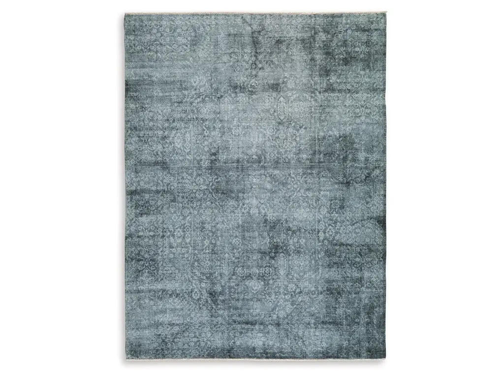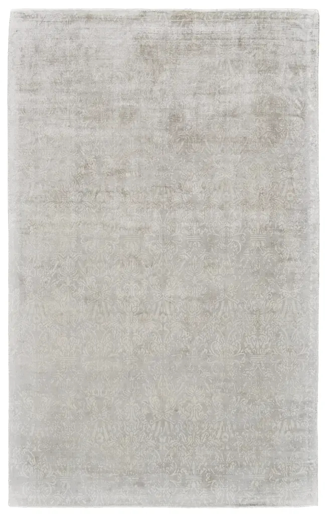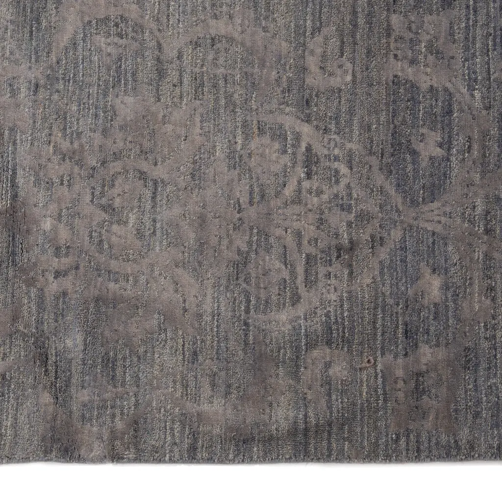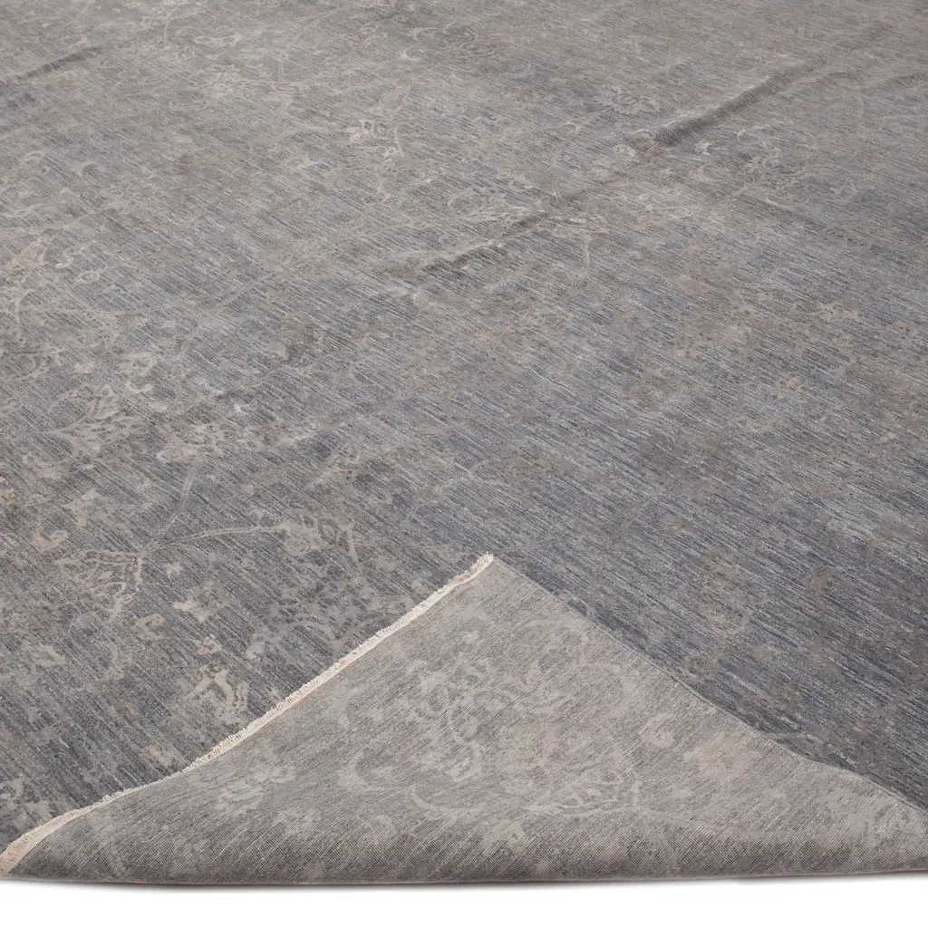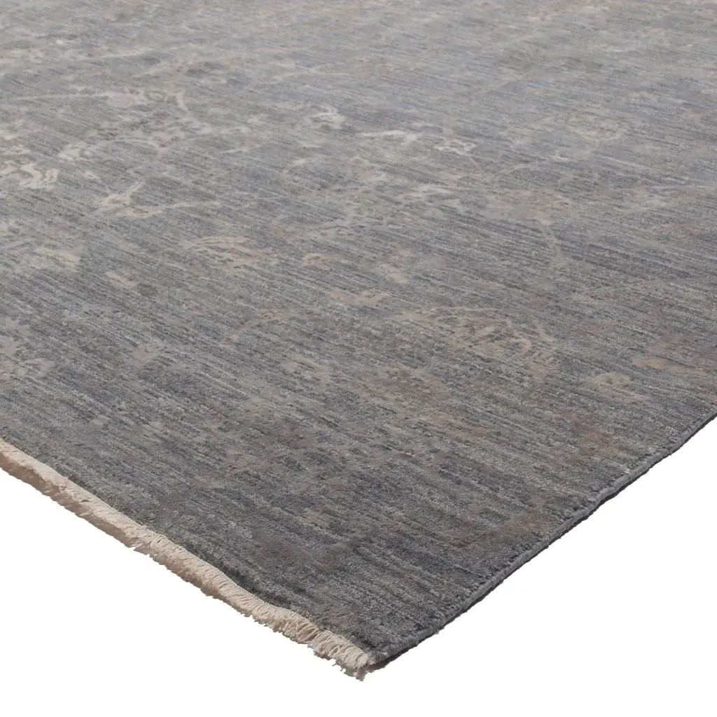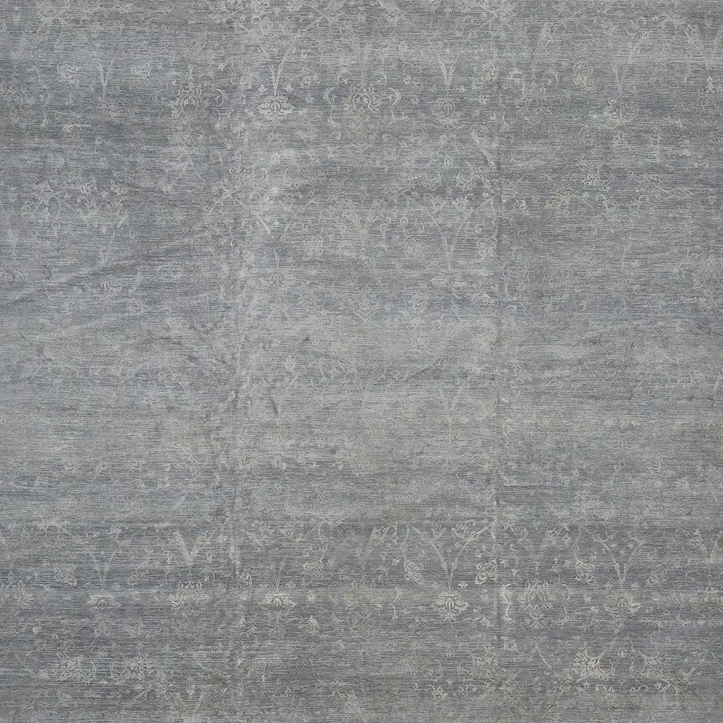 Woven in shimmering silk, traditional motifs emerge from a cooling grey palette and distressed patina in this transitional silk rug. With room to breathe and surrounded by cultivated objects, the details of this luminous rug will come alive in their form, and their storied wisdom will surely seep into the spaces they inhabit.