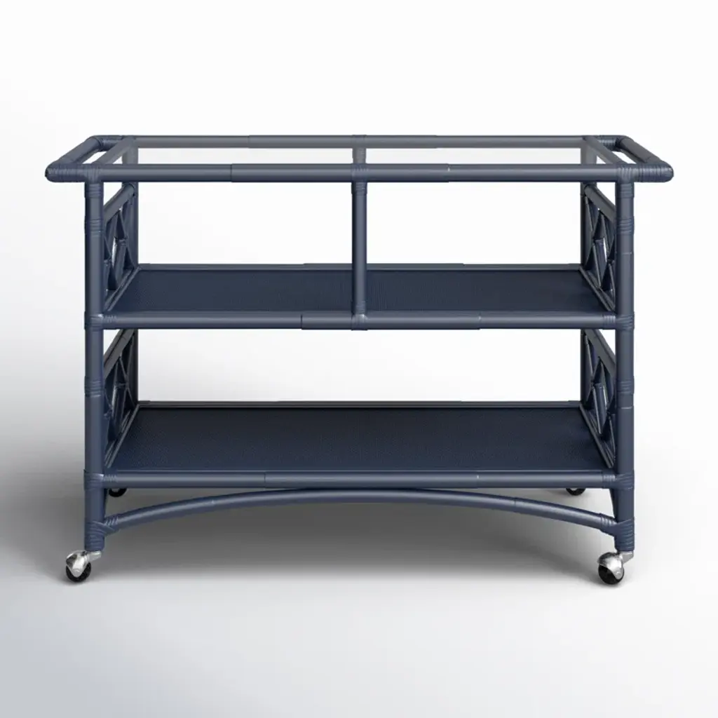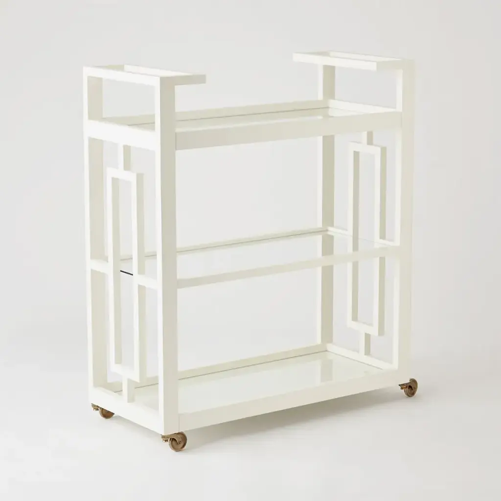 Reminiscent of the entertainment of the mid-century, the Grid Block Bar Cart captures the geometric architecture and furniture of the time period. The matte white lacquer finish brings a sophisticated elegance to this modern design. Features integrated handles, three tiers of removable glass shelves, and fully rotational cast brass wheels. From a fashion forward perspective, Global Views offers accessories, furniture, statement lighting, and an assortment of rugs and mirrors to add beauty and joy to your home.
