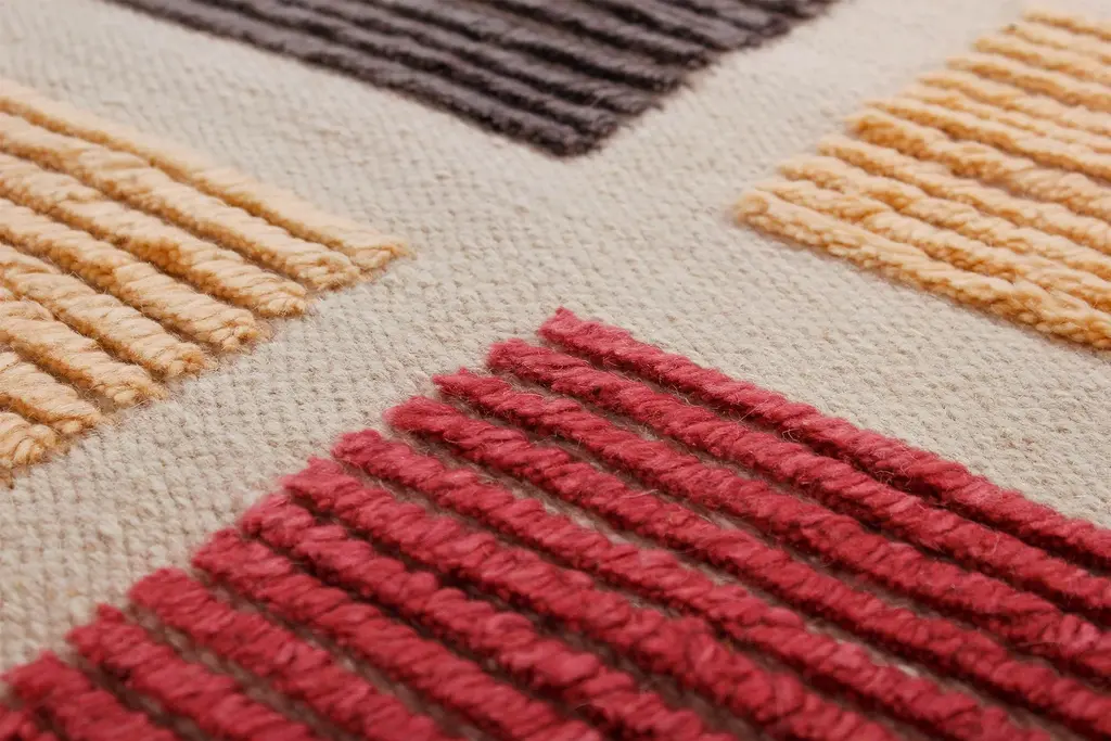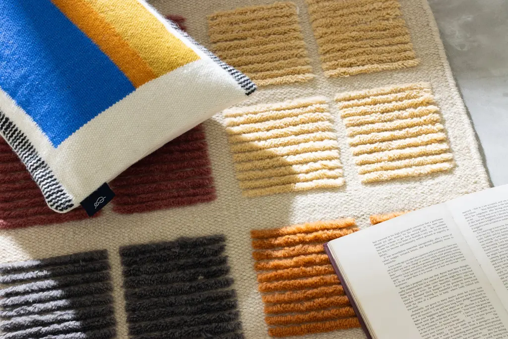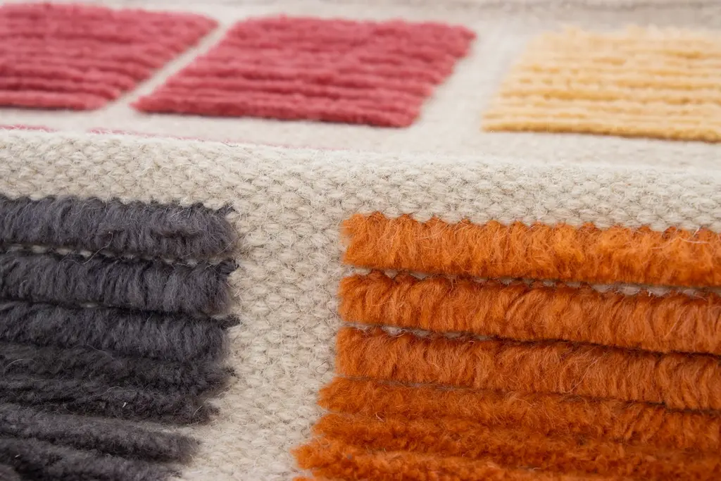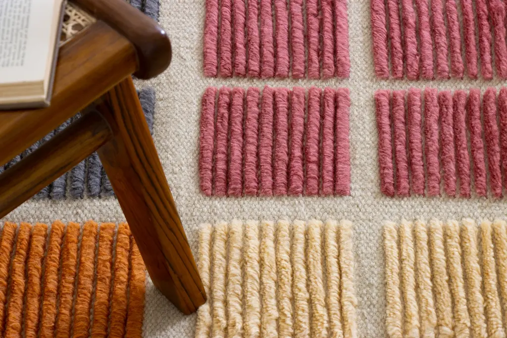 A combination between flatweave and hand-knotted, these rugs have a flatwoven ground, punctuated by the soft glamour of raised, cut-pile motifs in rich earth tones and neutrals. Named for Los Angeles stars of page and screen, these rugs are woven with premium New Zealand wool.