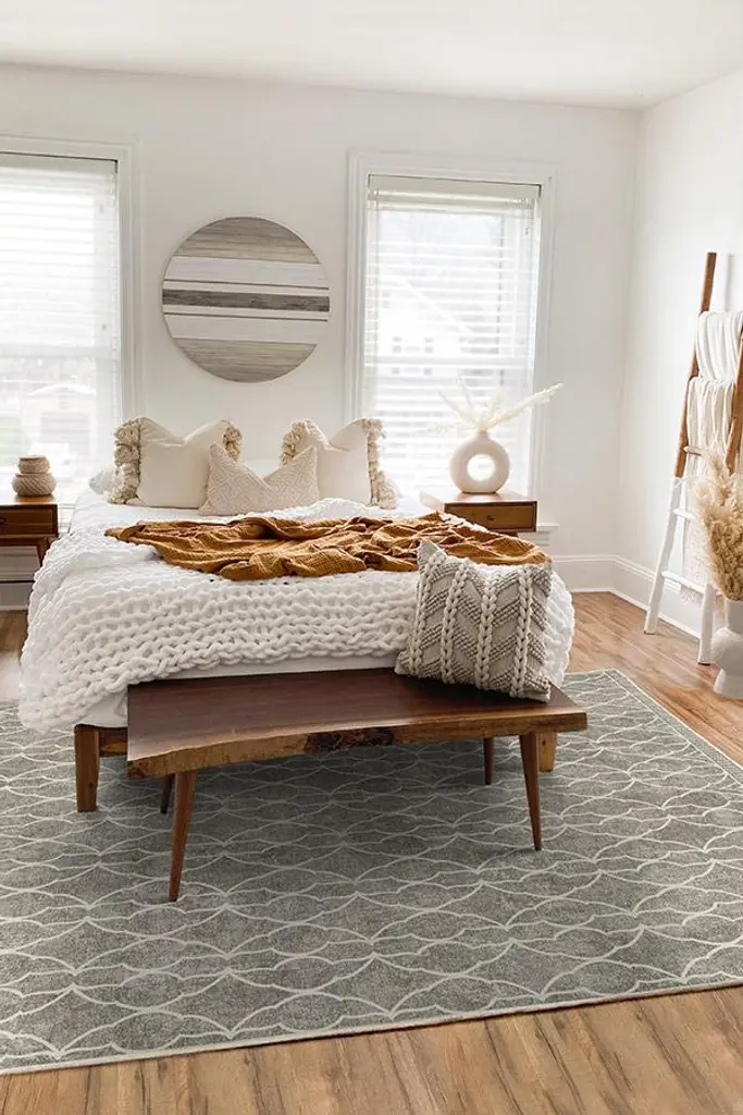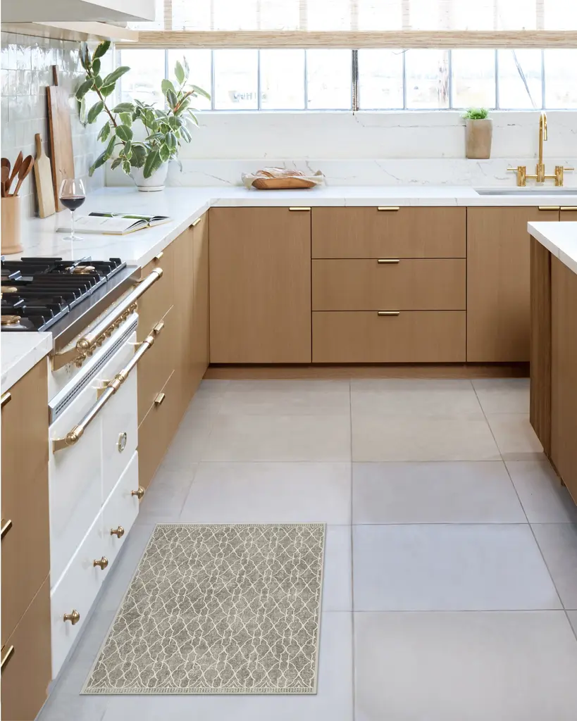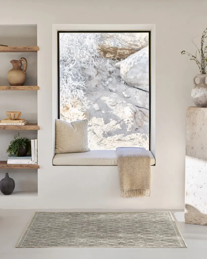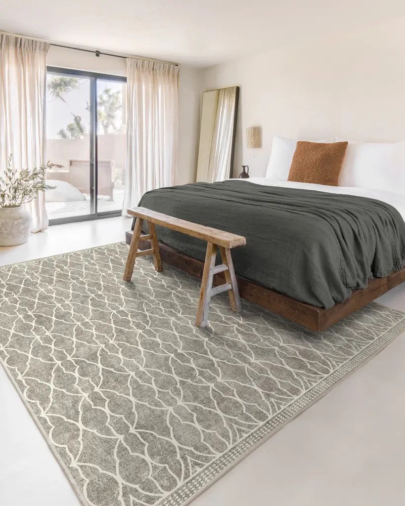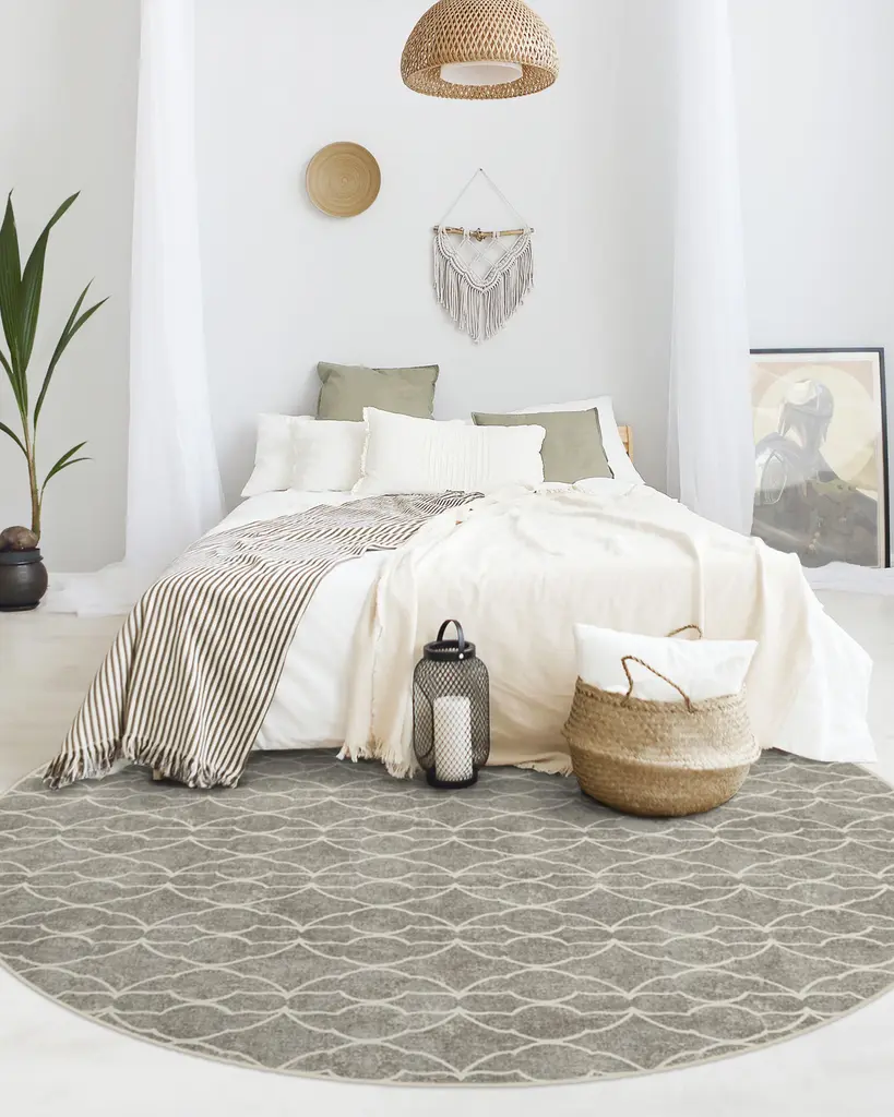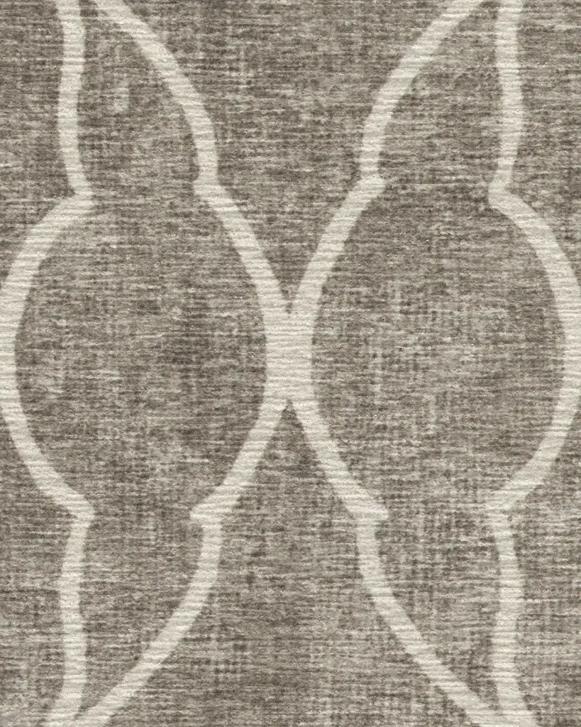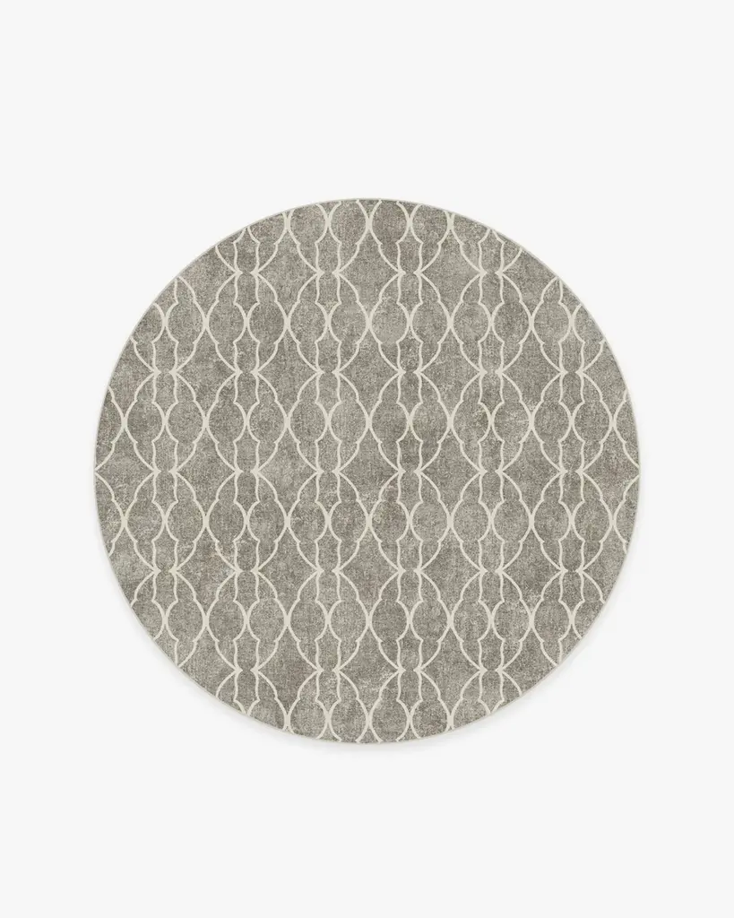 A classic trellis pattern with a sci-fi feel. This machine-washable rug features the outline of Grogu's iconic head in a trellis pattern. An elegant and versatile design in off-white on a textured ash grey background.