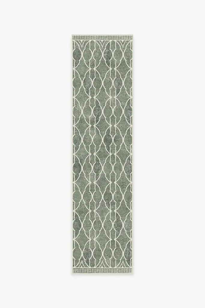 Not your typical Grogu rug. Our Grogu™ Trellis Sage Green Rug features just the outline of the iconic Mandalorian character's head repeated in a trellis pattern. Its minimalistic and modern design is colored in off-white on a distressed sage green background. Water-resistant, stain-resistant, and machine-washable.