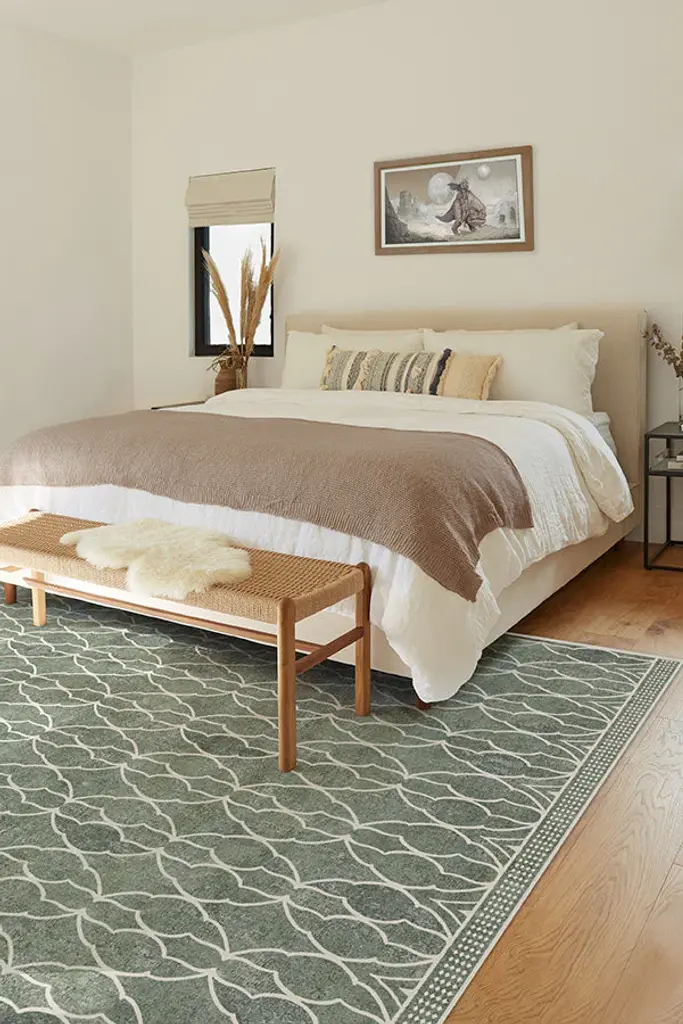 Not your typical Grogu rug. Our Grogu Trellis Sage Green Rug features just the outline of the iconic Mandalorian character's head repeated in a trellis pattern. Its minimalistic and modern design is colored in off-white on a distressed sage green background. Water-resistant, stain-resistant, and machine-washable.