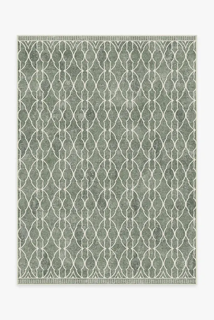 Not your typical Grogu rug. Our Grogu™ Trellis Sage Green Rug features just the outline of the iconic Mandalorian character's head repeated in a trellis pattern. Its minimalistic and modern design is colored in off-white on a distressed sage green background. Water-resistant, stain-resistant, and machine-washable.