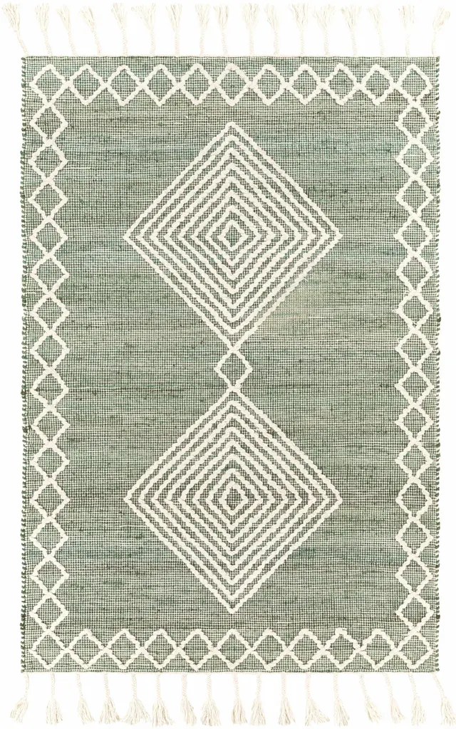 Collection: Guiuan Colors: Cream, MediumGreen Construction: Hand Woven Material: 60% Jute,40% Wool Pile: No Pile Styles: Transitional,Bohemian Made In: India Thickness: 0.31" Fringe Length: 8.5" Price Range: $$$$$ (Affordable)