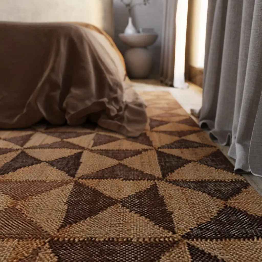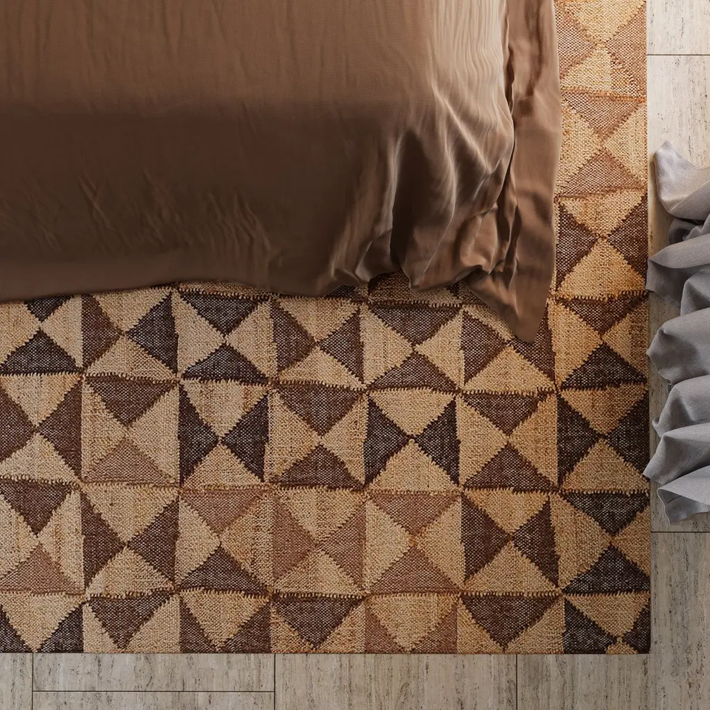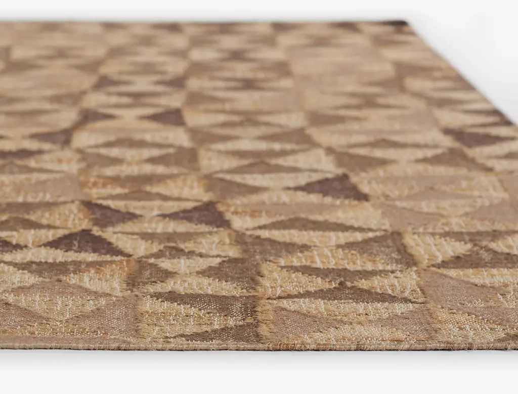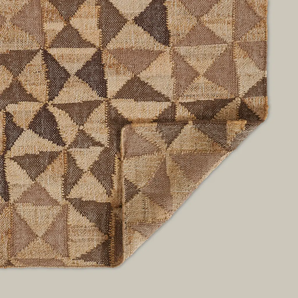 Grounded in the beauty of raw materials, the Gurara Chevrette's tones and textures are inspired by traditional African Kuba designs that feature geometric, repetitive patterns. Hand woven with a blend of jute and wool fibers, making it a strong, durable and slightly textured flat weave construction. Varying shades of contrasting neutral triangles give this rug another layer of dimensional quality that builds on its handmade appeal.