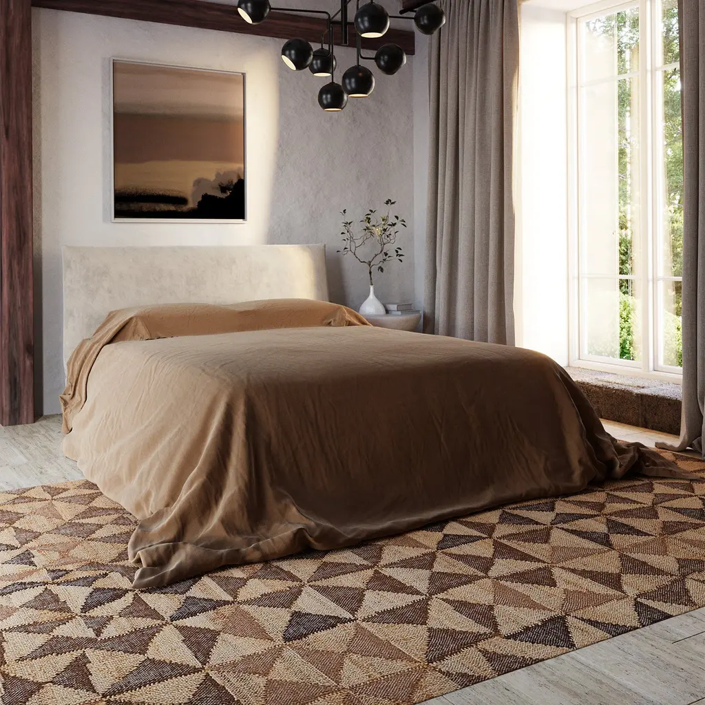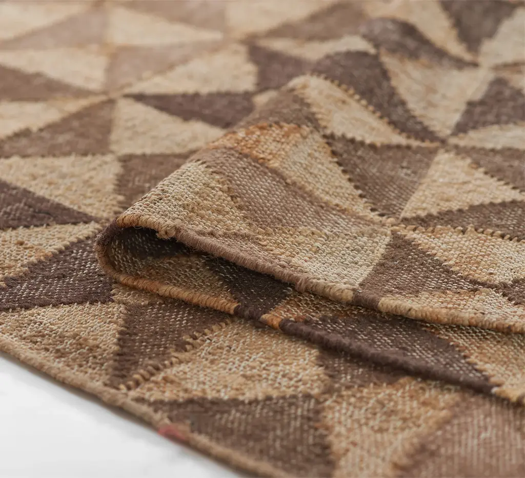 Grounded in the beauty of raw materials, the Gurara Chevrette's tones and textures are inspired by traditional African Kuba designs that feature geometric, repetitive patterns. Hand woven with a blend of jute and wool fibers, making it a strong, durable and slightly textured flat weave construction. Varying shades of contrasting neutral triangles give this rug another layer of dimensional quality that builds on its handmade appeal.