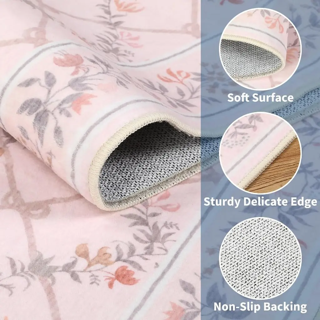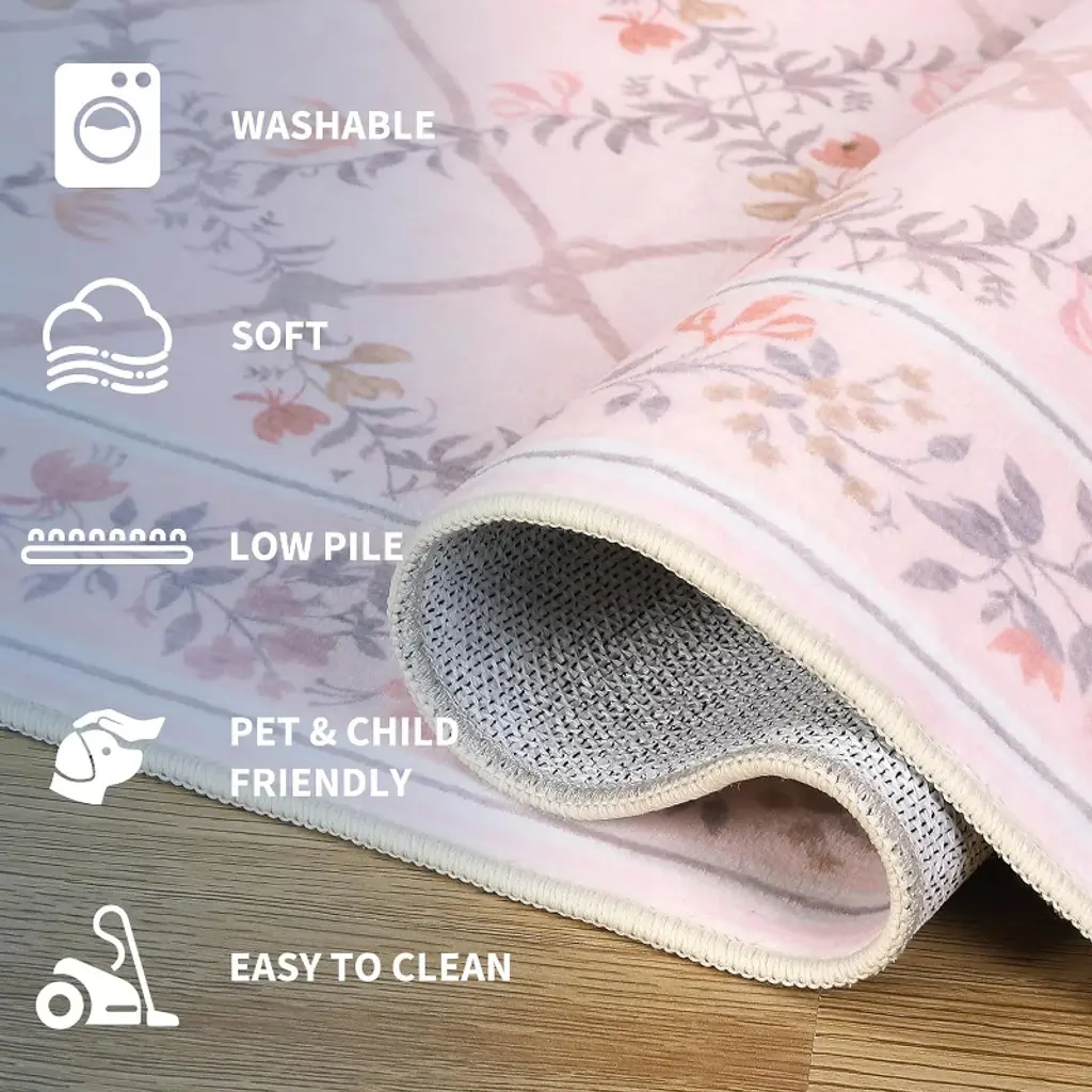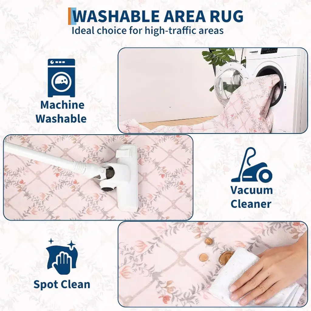 This machine-washable rug is crafted from durable, high-quality faux wool with a low-pile, stain-resistant design that withstands high traffic and is easy to clean, making it ideal for homes with kids and pets. It features a non-slip TPR backing for safety, a charming floral pattern for elegant home decor, and simple care instructions to quickly smooth out any initial creases upon arrival.