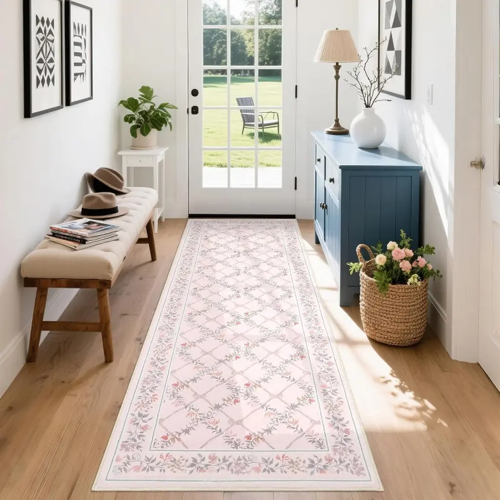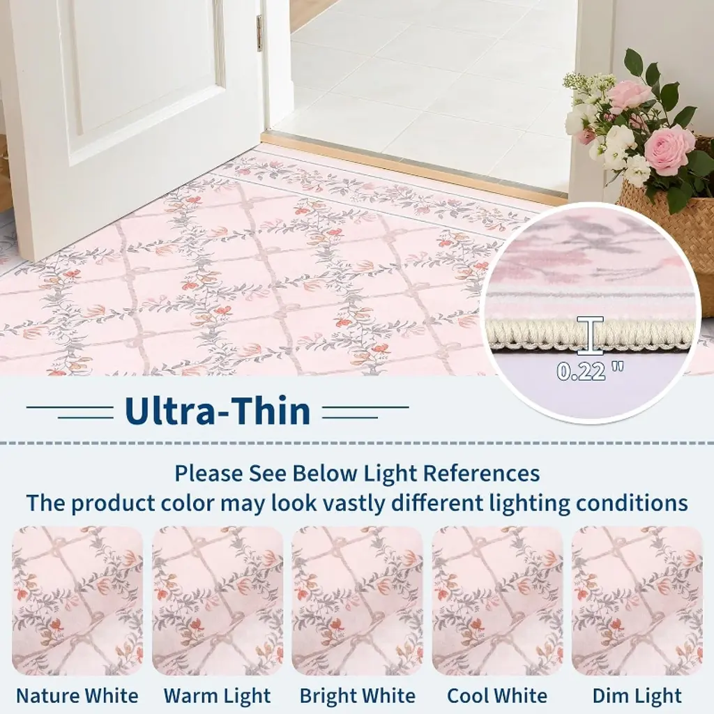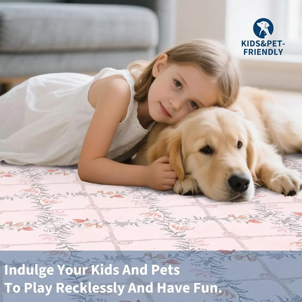 This machine-washable rug is crafted from durable, high-quality faux wool with a low-pile, stain-resistant design that withstands high traffic and is easy to clean, making it ideal for homes with kids and pets. It features a non-slip TPR backing for safety, a charming floral pattern for elegant home decor, and simple care instructions to quickly smooth out any initial creases upon arrival.